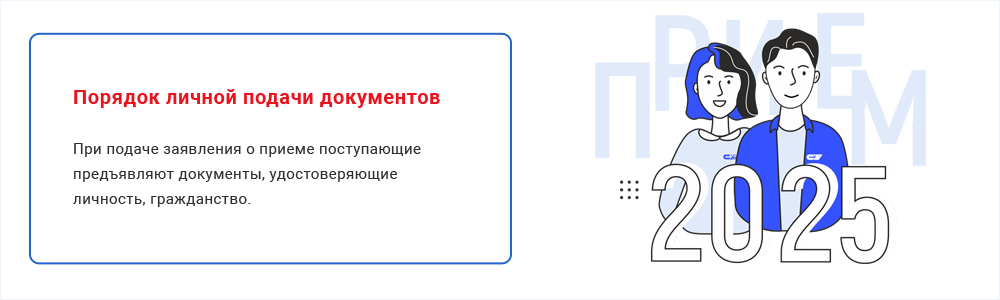 При личной подаче заявления о приеме поступающие предъявляют документы, удостоверяющие личность.