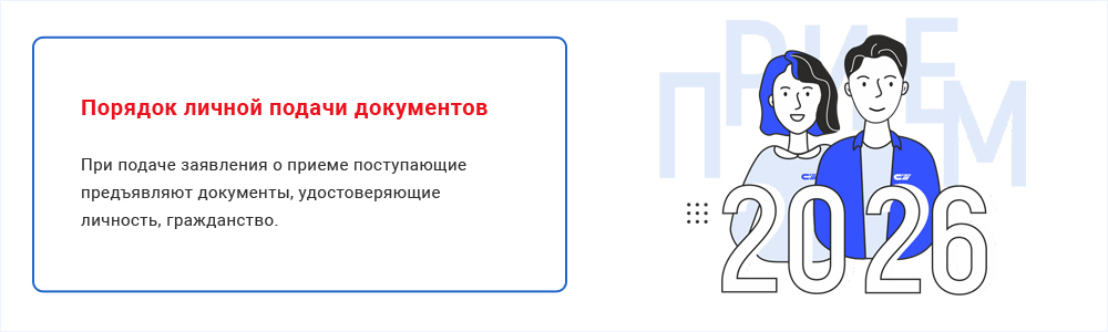 При личной подаче заявления о приеме поступающие предъявляют документы, удостоверяющие личность.