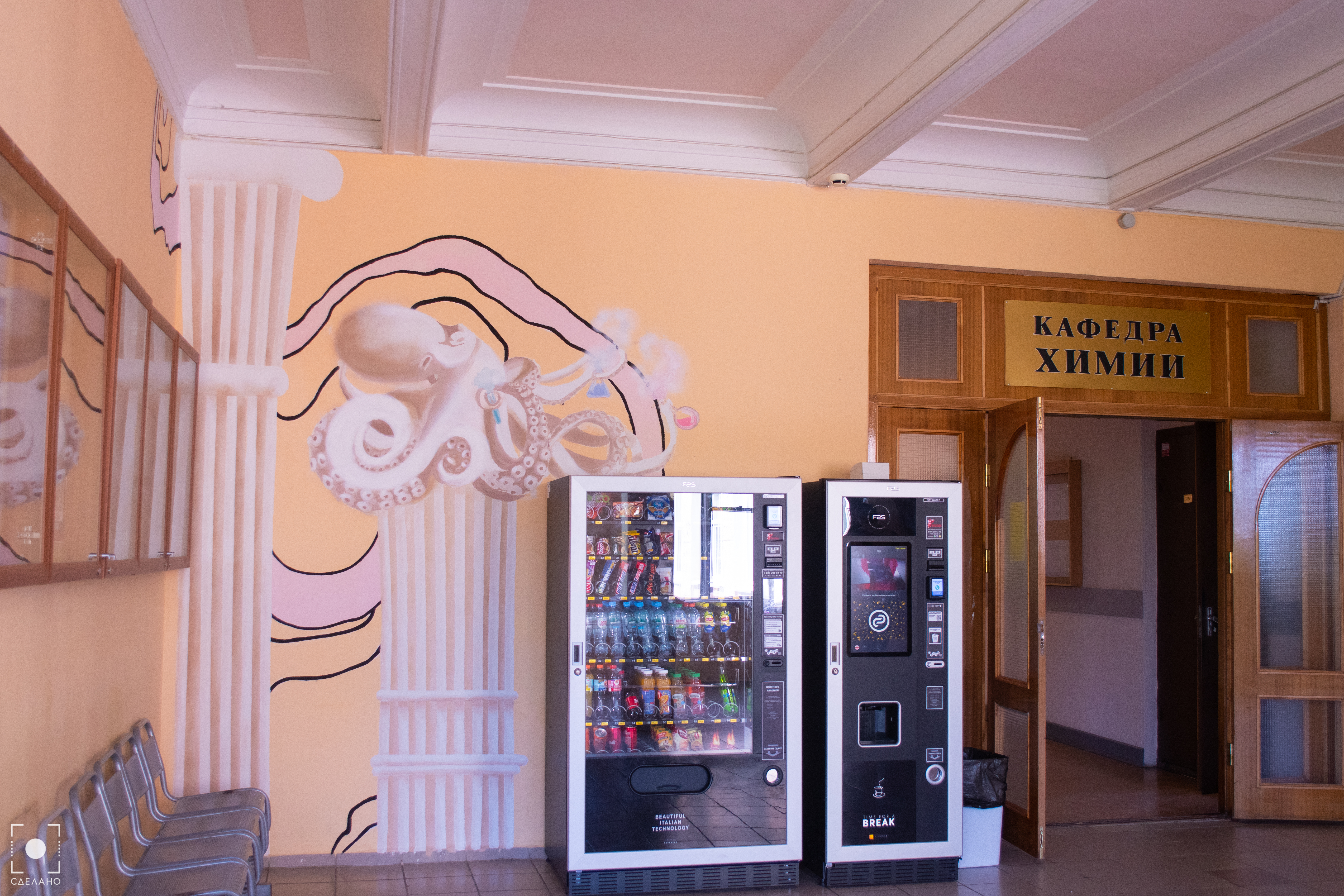 Другой мурал находится на третьем этаже. Это осьминог, совершающий одновременно множество манипуляций с химическими веществами. Автор рисунка – студентка Елизавета Боровикова.