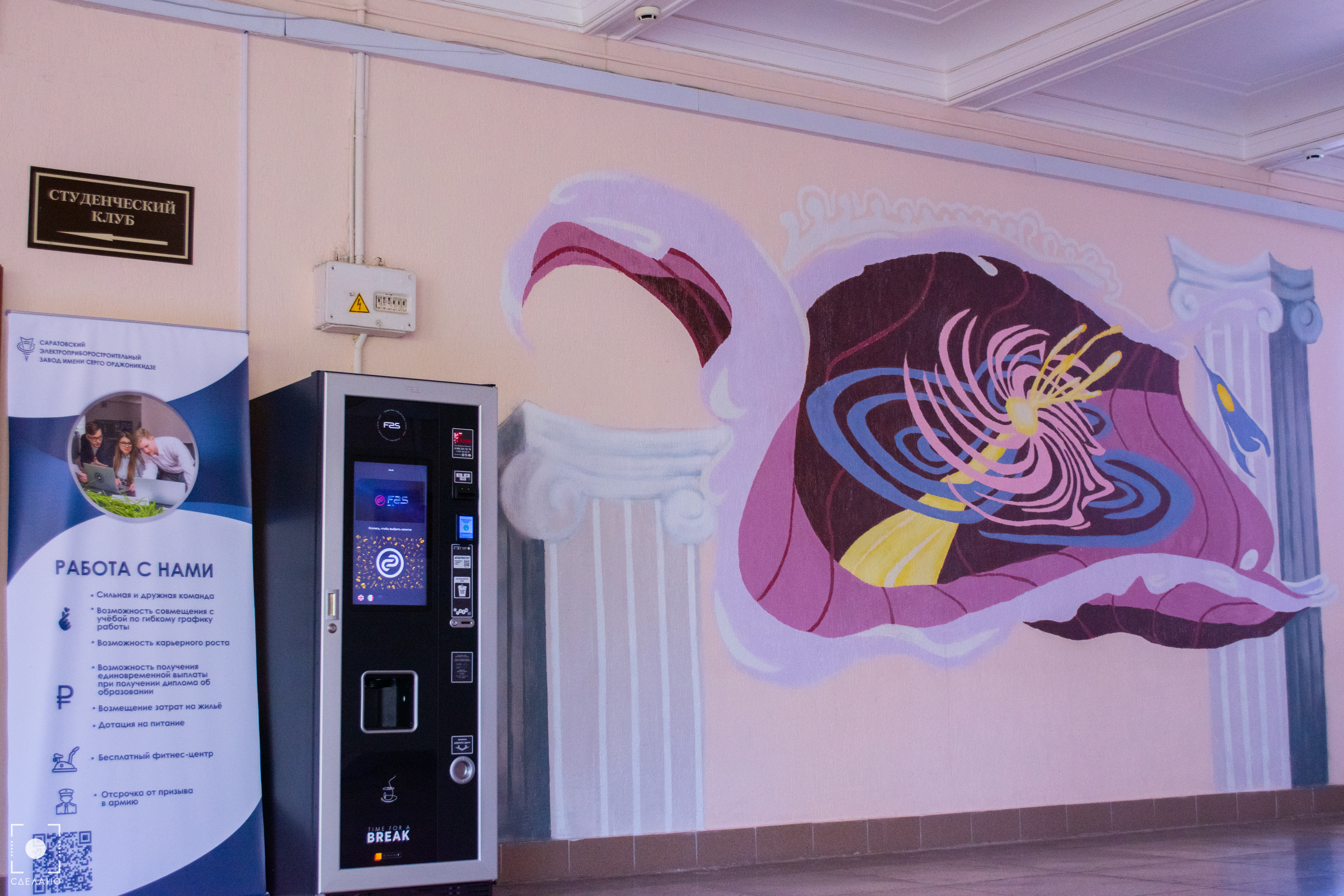 В первом корпусе Саратовского государственного технического университета имени Гагарина Ю.А. появились два мурала, созданные студентами направления «Дизайн» Института прикладных информационных технологий и коммуникаций под руководством дизайнера Полины Свирщевой.
