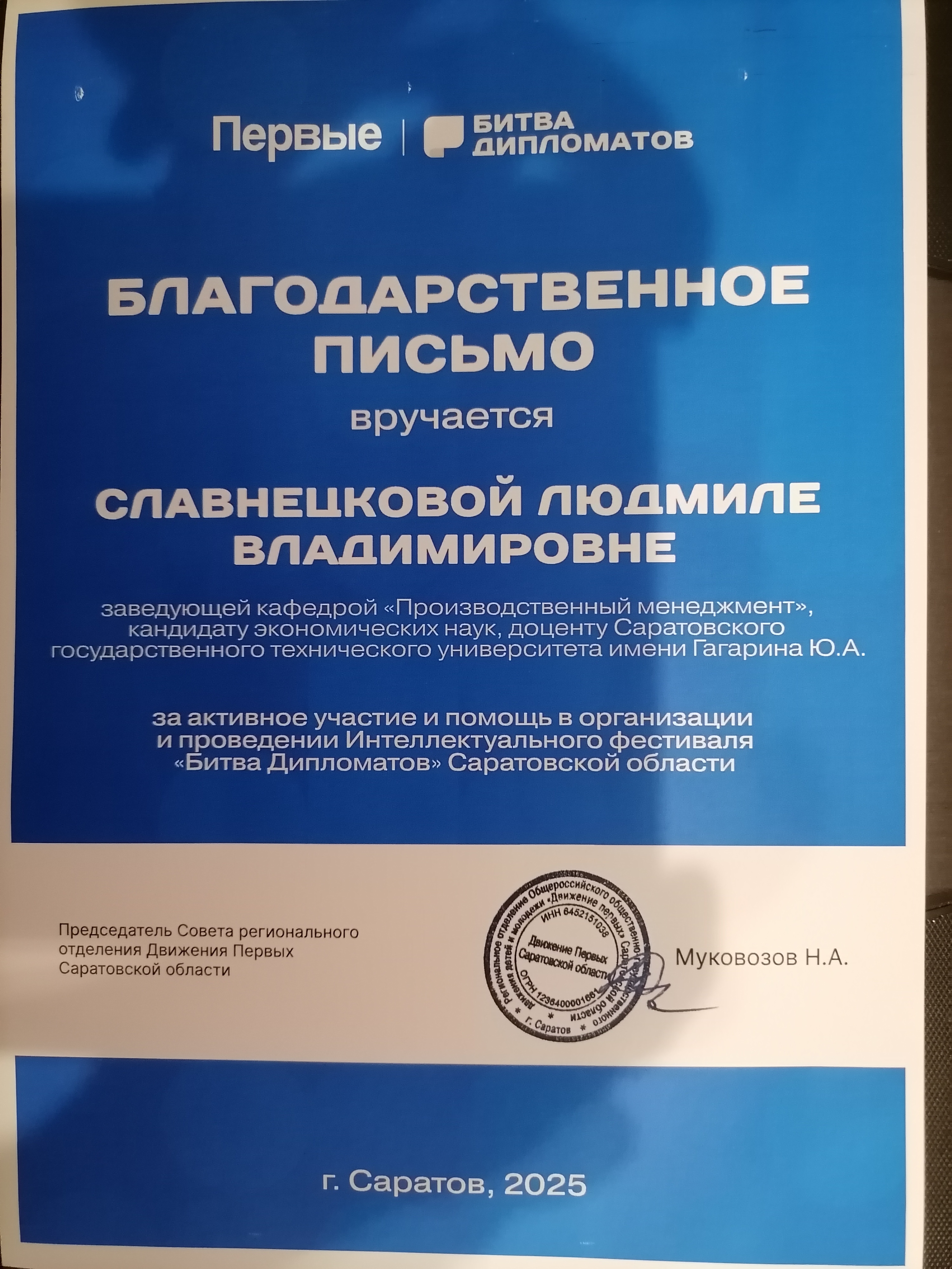 Заведующий кафедрой «Производственный менеджмент» Социально-экономического института Саратовского государственного технического университета имени Гагарина Ю.А. Людмила Славнецкова приняла участие в финальном мероприятии проекта Движения Первых «Управленческие поединки - «Битва дипломатов» в качестве эксперта. Мероприятие прошло на площадке Саратовского архитектурно-строительного колледжа.