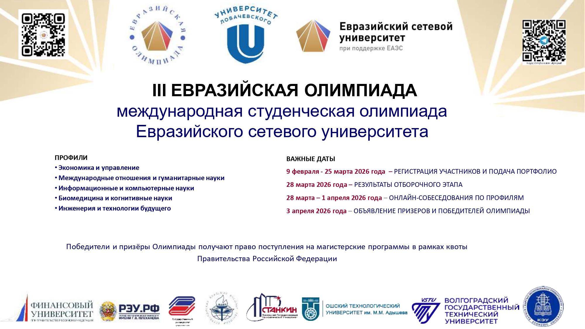 Олимпиада проводится на русском языке в дистанционном формате и направлена на развитие евразийского образовательного и научного пространства, поддержку талантливых студентов и выпускников российских и зарубежных вузов, желающих продолжить обучение в магистратуре Евразийского сетевого университета по приоритетным направлениям развития ЕАЭС.