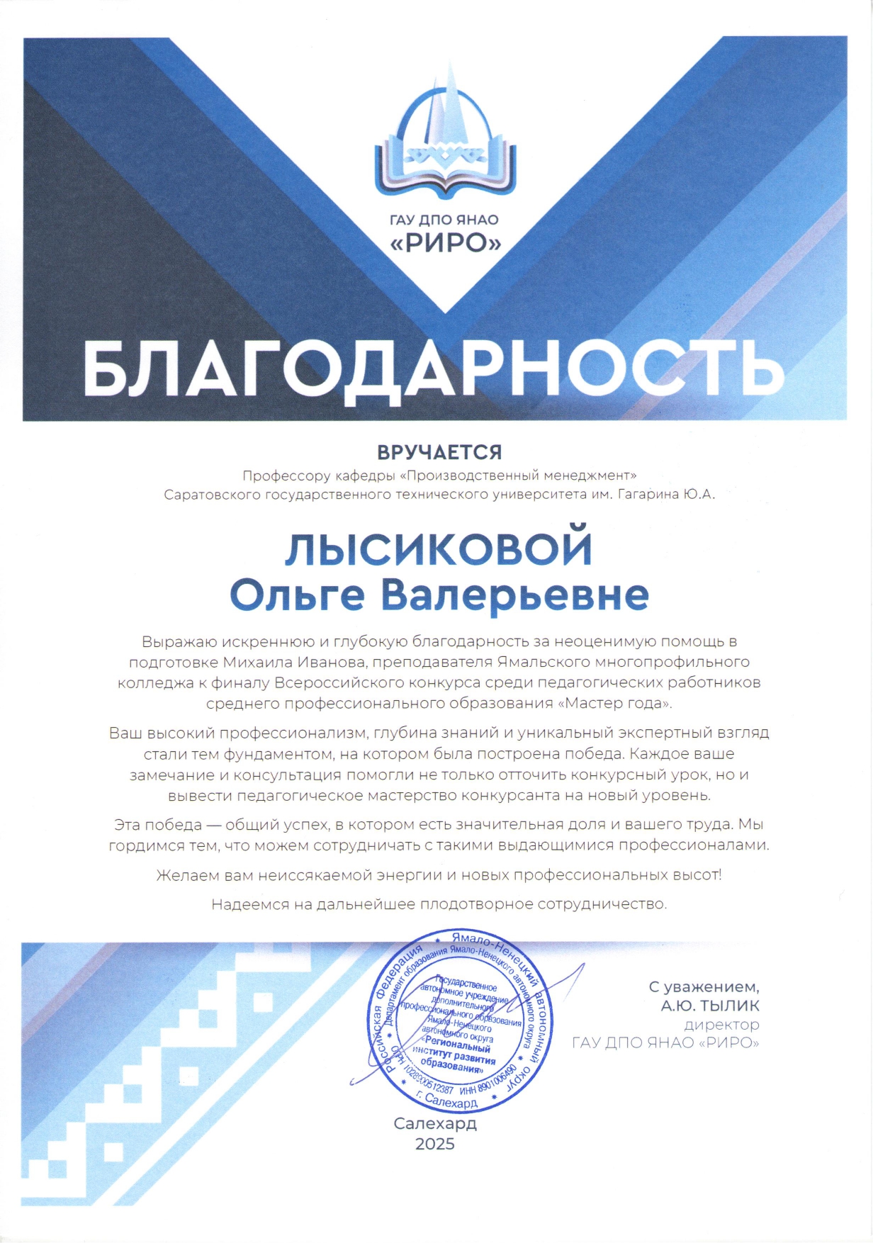 Профессор кафедры «Производственный менеджмент» Социально-экономического института Саратовского государственного технического университета имени Гагарина Ю.А. Ольга Лысикова отмечена благодарностью за вклад в подготовку преподавателя Ямальского многопрофильного колледжа Михаила Иванова к финалу Всероссийского конкурса работников среднего профессионального образования «Мастер года».