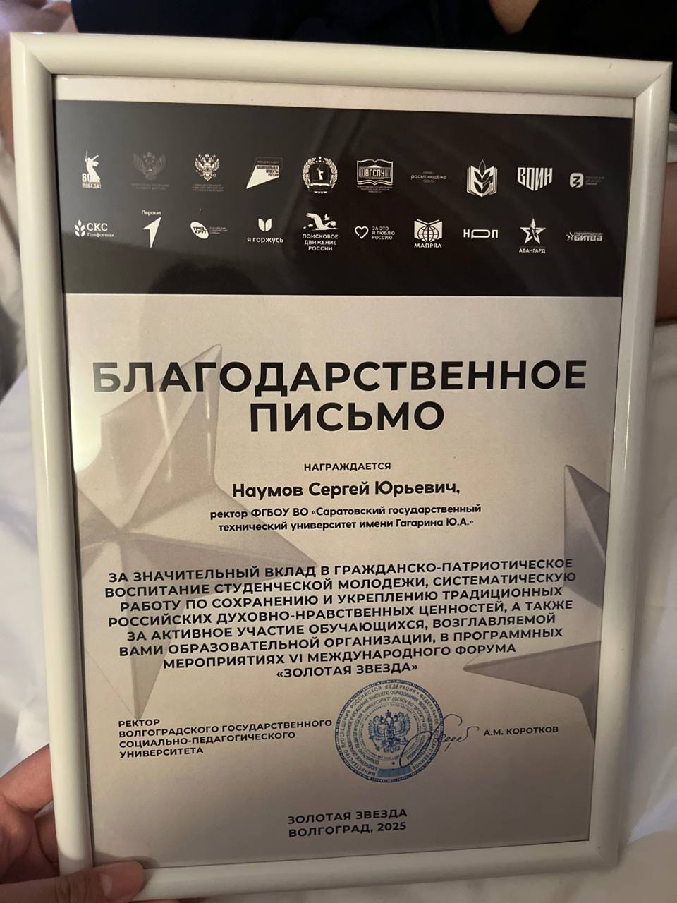 Ректору Саратовского государственного технического университета имени Гагарина Ю.А., профессору Сергею Наумову было передано благодарственное письмо от организаторов форума «За значительный вклад в гражданско-патриотическое воспитание студенческой молодежи, систематическую работу по сохранению и укреплению традиционных российских духовно-нравственных ценностей, а также за активное участие обучающихся, возглавляемой вами образовательной организации, в программных мероприятиях VI Международного форума «Золотая Звезда».
