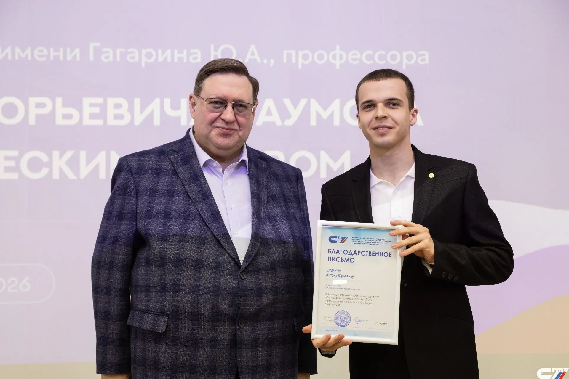 В рамках церемонии награждения студенты СГТУ, ППК и ЭТИ были отмечены благодарственными письмами за высокие достижения на фестивале «Саратовская студенческая весна - 2026» и на региональном этапе Всероссийского конкурса интеллекта, спорта и творчества «Мисс и Мистер студенчество Саратовской области – 2026» и формирование положительного имиджа университета.