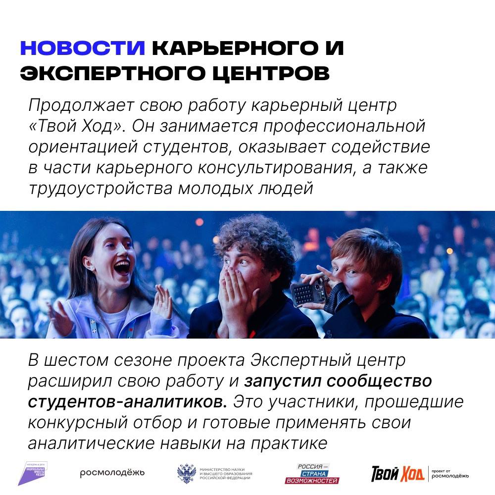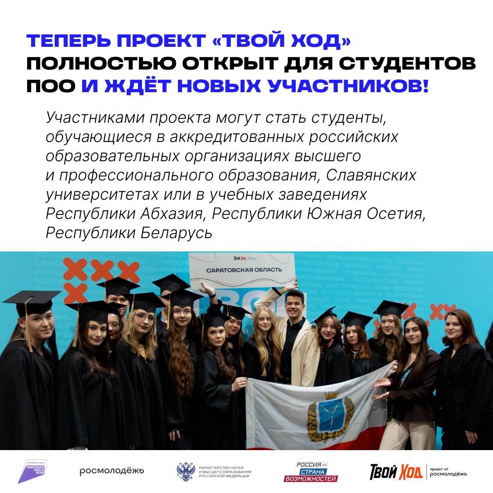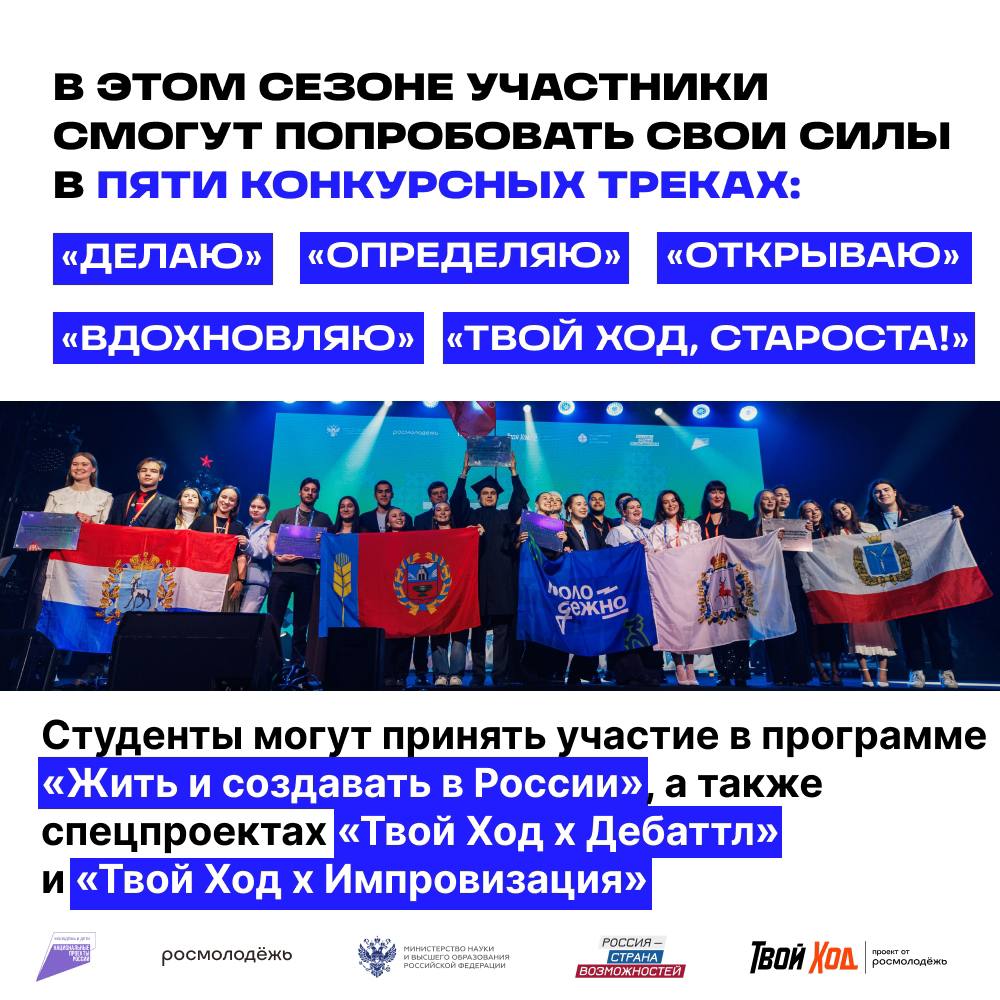 Проект «Твой ход» реализуется при поддержке Росмолодёжи, Минобрнауки России, а также входит в линейку проектов президентской платформы «Россия – страна возможностей».