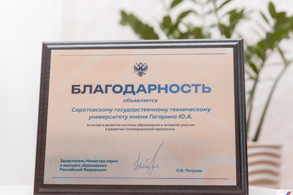 «Считаю, что благодаря стипендиальному движению мы можем привлекать и оставлять молодых людей в науке. Это очень важно. Молодежь – наше будущее, и если она будет продолжать научные исследования, то это в первую очередь поможет достичь нам того технологического лидерства и суверенитета, о которых сейчас так много говорится».Саратовский государственный технический университет имени Гагарина Ю.А. был отмечен Благодарностью Заместителя Министра науки и высшего образования Российской Федерации Ольги Петровой за вклад в развитие системы образования и активное участие в развитии стипендиальной программы.