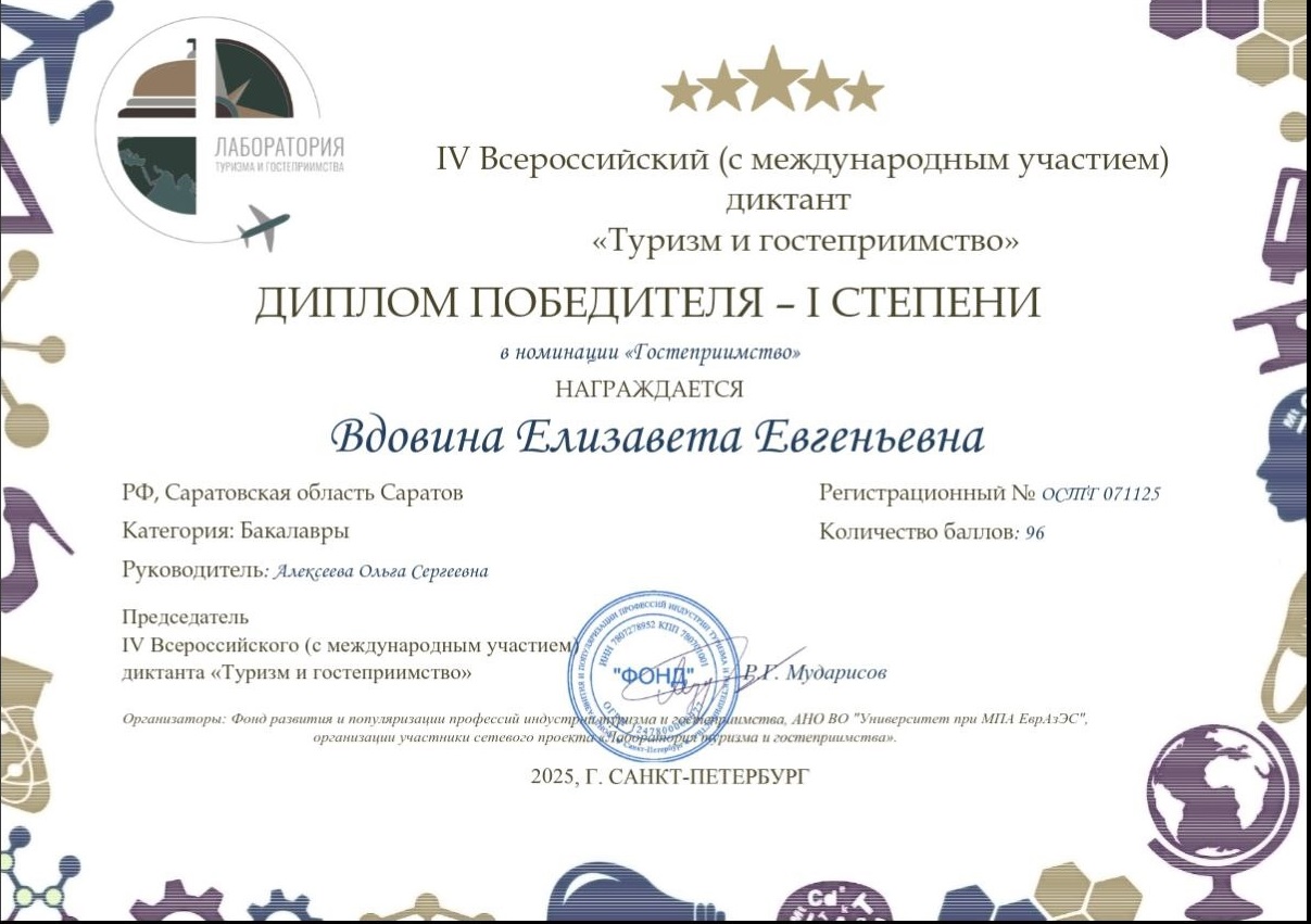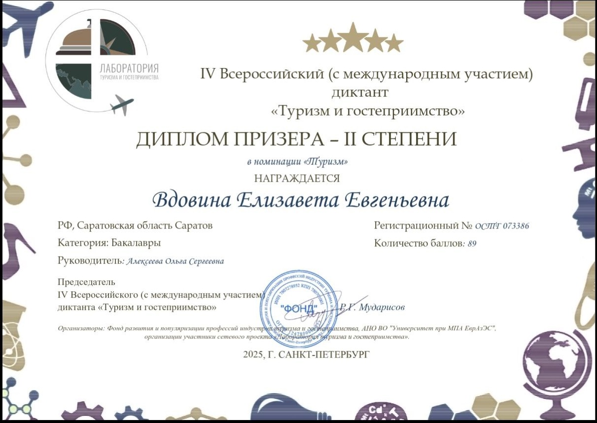Студентка 4 курса направления «Сервис» Социально-экономического института Саратовского государственного технического университета имени Гагарина Ю.А. Елизавета Вдовина стала победителем в номинации «Гостеприимство» (1 место), а также стала призером в номинации «Туризм» (2 место).
