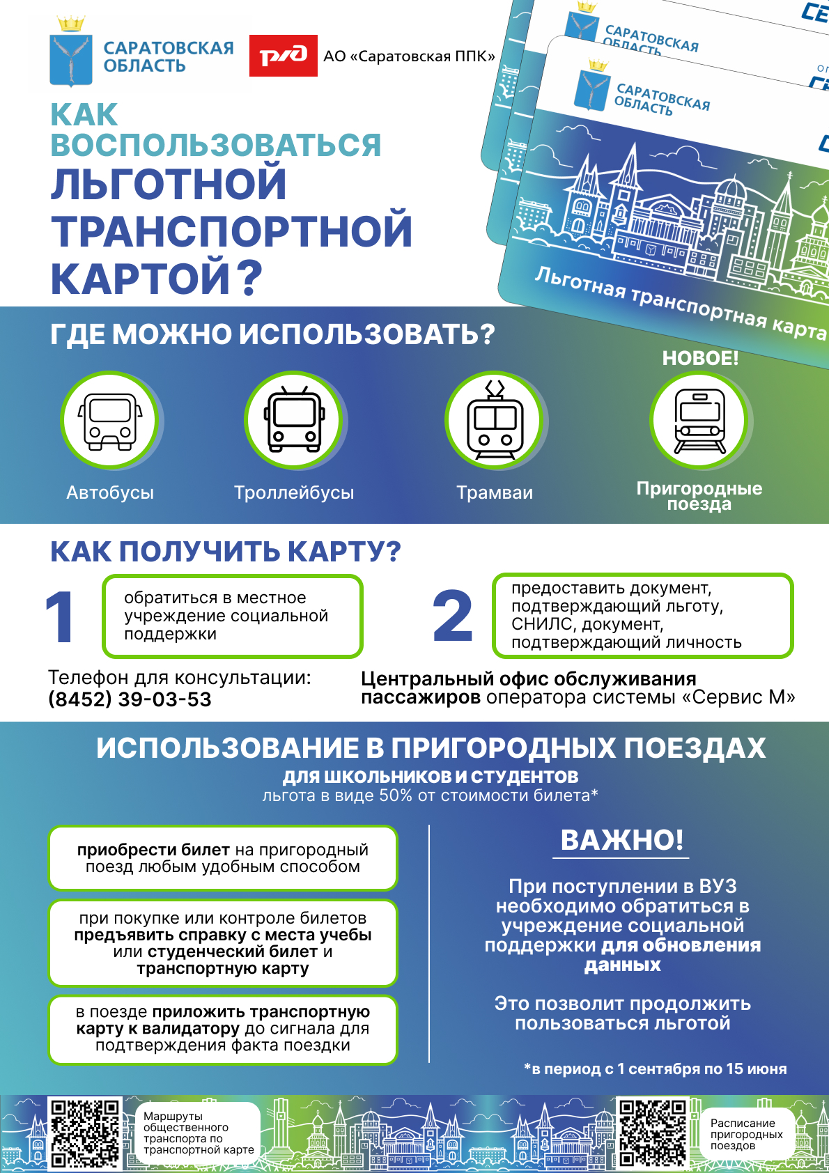 Министерство труда и социальной защиты области и «РЖД Саратовская пригородная пассажирская компания» напоминают о возможности приобретения льготного проездного билета для поездок железнодорожным транспортом в поездах пригородного сообщения.