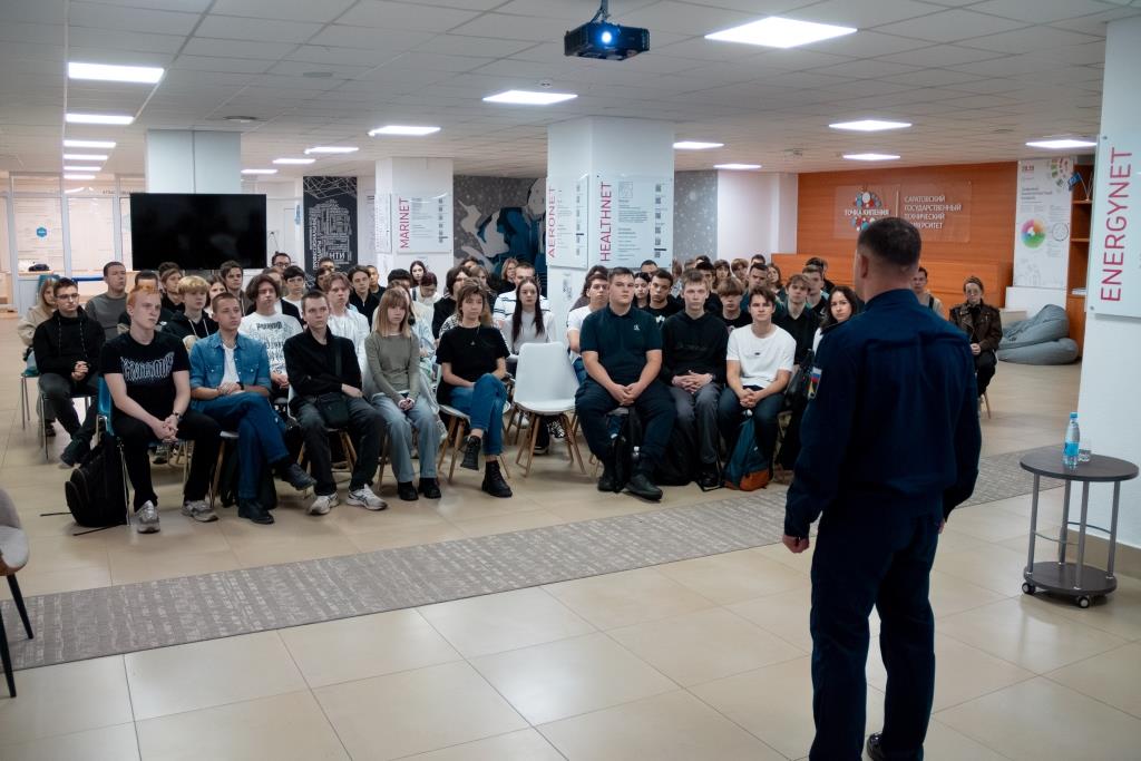 В преддверии Дня народного единства на площадке лектория Общества «Знание» в Саратовском государственном техническом университете имени Гагарина Ю.А. состоялась встреча студентов с кавалером «Ордена Мужества», участником специальной военной операции и лектором Общества «Знание» Магамедом Мамедовым. Мероприятие прошло в рамках Всероссийской акции «Россия – семья семей».