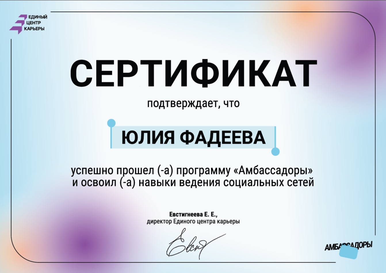 Четыре месяца участники программы «Амбассадоры» прокачивали навыки ведения социальных сетей: улучшали визуал публикаций и карьерного сообщества, повышали активность подписчиков, пробовали применять искусственный интеллект при создании материалов. Сотрудники Центра карьеры еженедельно выполняли задания по наполнению сообщества в социальных сетях контентом, участвовали в вебинарах по теме медиа-сопровождения деятельности Центра карьеры от ведущих специалистов отрасли.