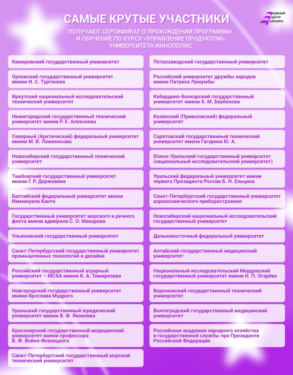 По итогам обучения Центр карьеры СГТУ вошёл в топ-25 лучших карьерных подразделений вузов по всей России. Представители Политеха получили сертификат о прохождении программы «Амбассадоры» и обучения по курсу «Управление продуктом» Университета Иннополис.