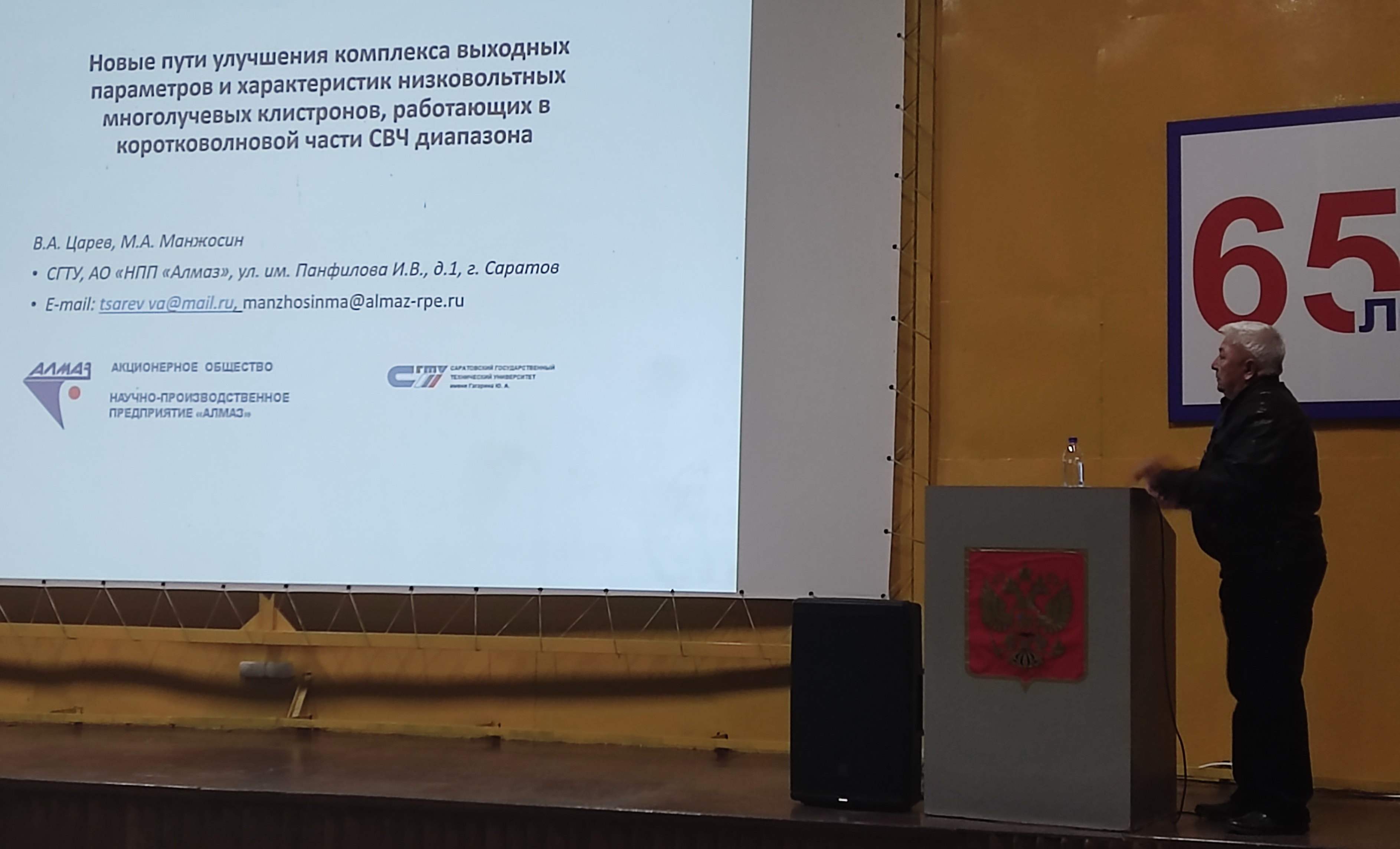 Доктор технических наук, профессор кафедра «Электронные приборы и устройства» Института электронной техники и приборостроения СГТУ Владислав Царев выступил с докладом на тему «Новые пути улучшения комплекса выходных параметров и характеристик низковольтных многолучевых клистронов, работающих в коротковолновой части СВЧ-диапазона».