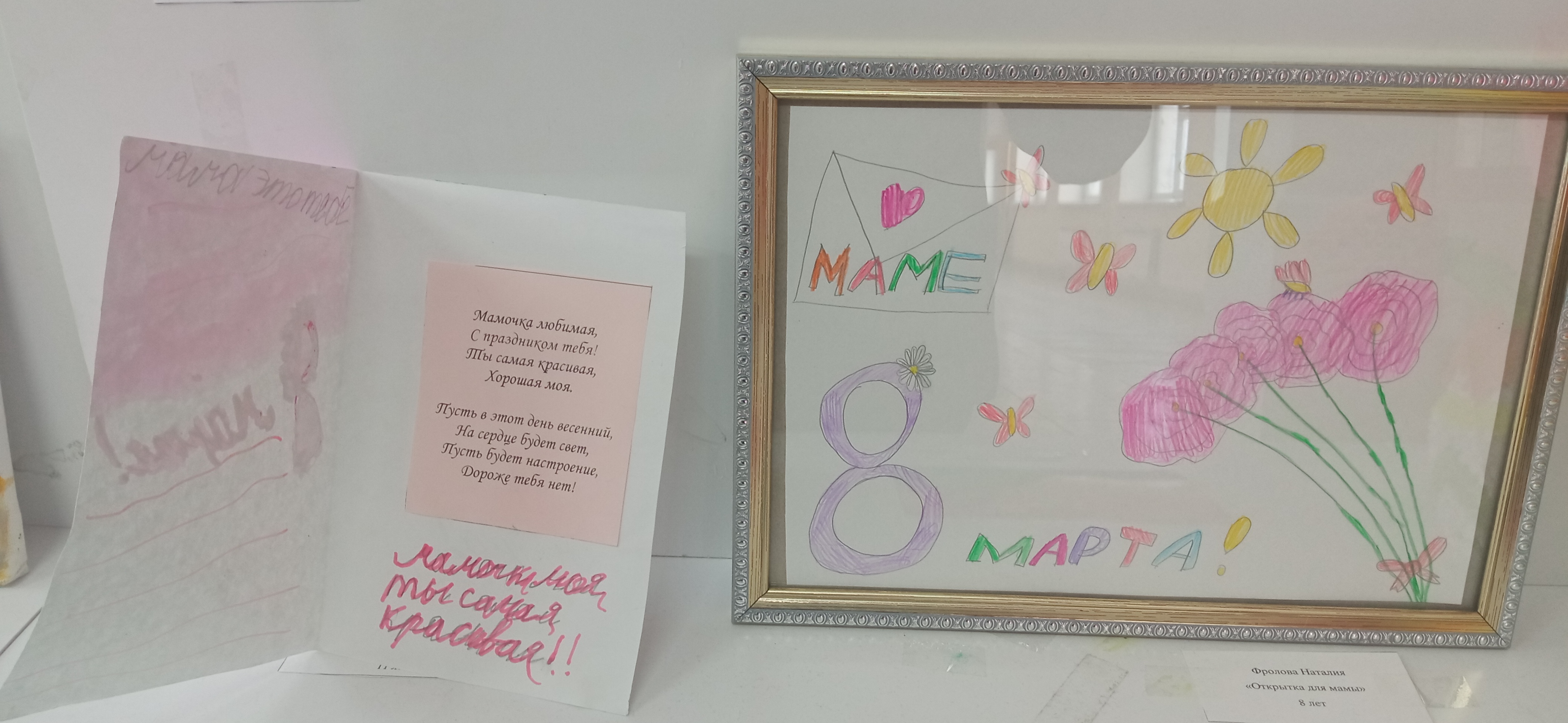 - Аркадий Иванов, 11 лет – «С праздником!» и Глафира Иванова, 8 лет – «Маму поздравляю!» (яркие рисунки);