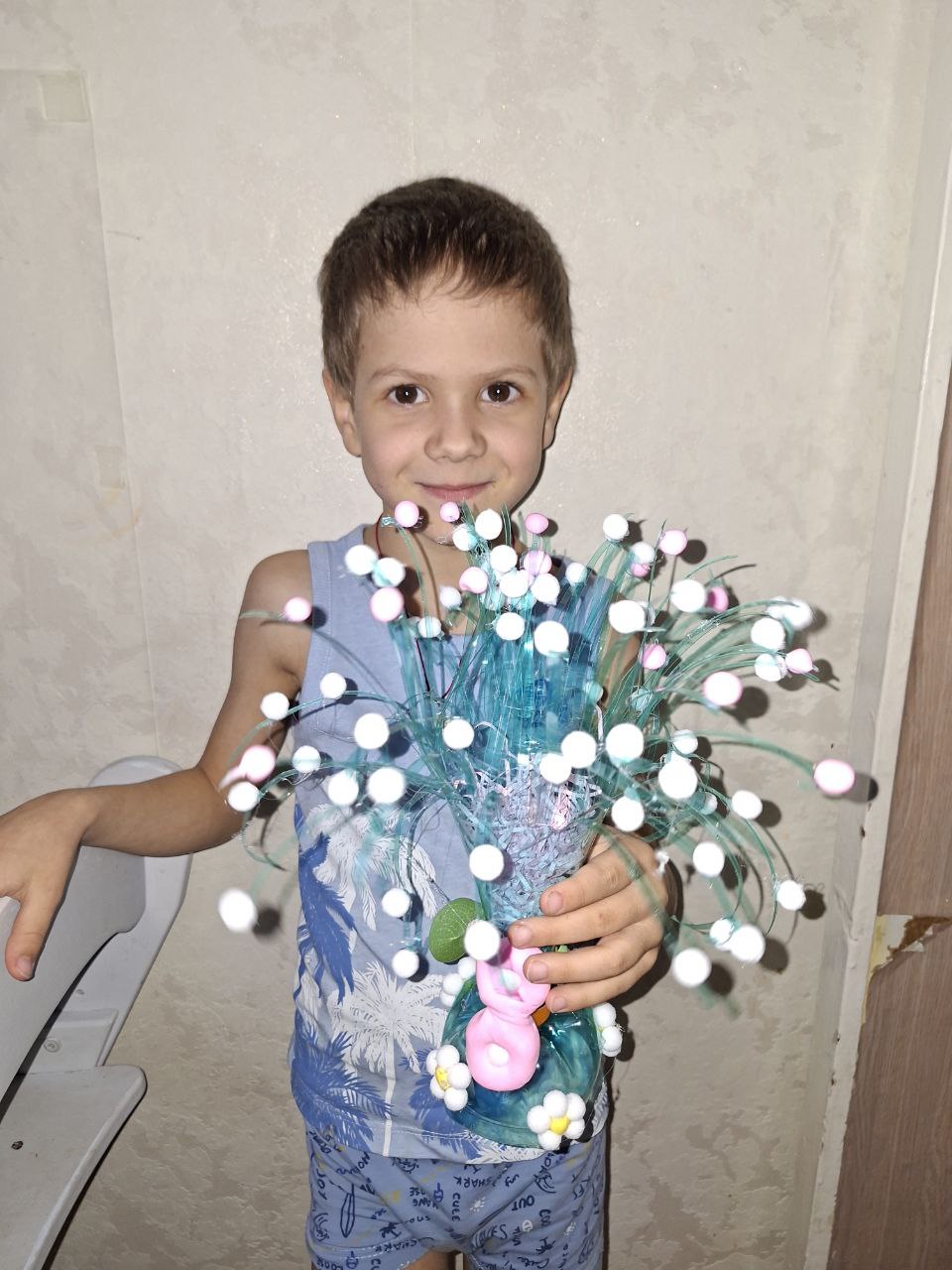 - Элина Артемина, 7 лет – «Букет для мамы» и Михаил Сальников, 3 года – «Букет для бабушки» (красивые солнечные поделки).