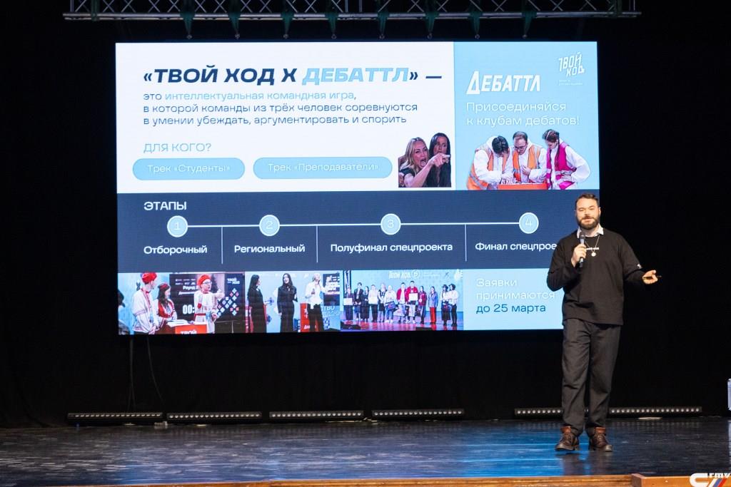 Федеральные тренеры проекта «Твой Ход» рассказали о правилах участия в конкурсных треках «Делаю», «Твой Ход, староста!», «Вдохновляю», «Определяю» и «Открываю». Также спикеры сделали акцент на дополнительных возможностях спецпроектов «Твой Ход х Импровизация», «Твой Ход х Дебаттл» и флагманской программы «Жить и создавать в России».