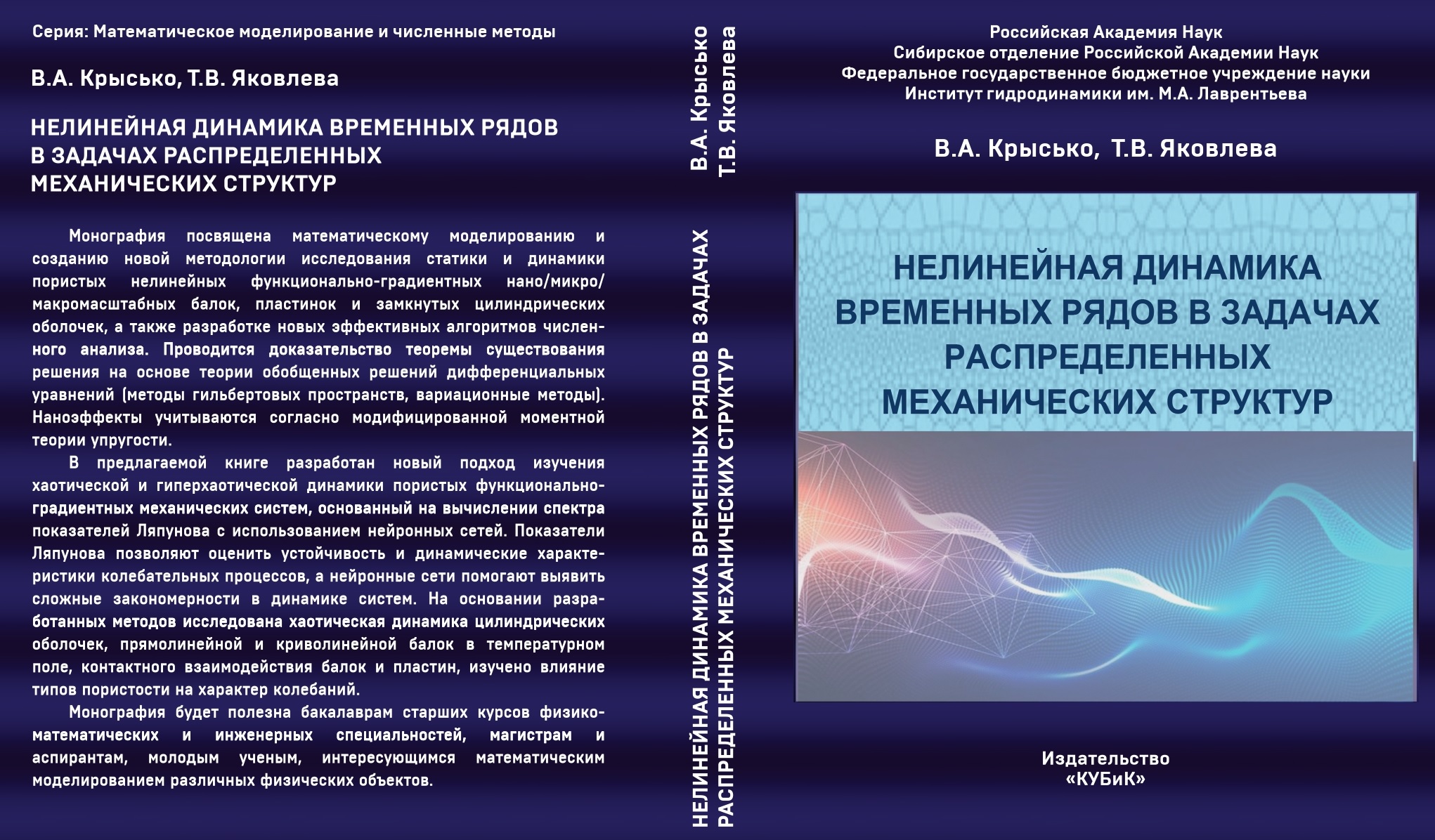 В свет вышла прорывная монография «Нелинейная динамика временных рядов в задачах распределенных механических структур», авторами которой являются заведующий кафедрой «Математика и моделирование» Физико-технического института Саратовского государственного технического университета имени Гагарина Ю.А., д.т.н., профессора Вадим Крысько и докторант, к.ф.-м.н., доцент Татьяна Яковлева.