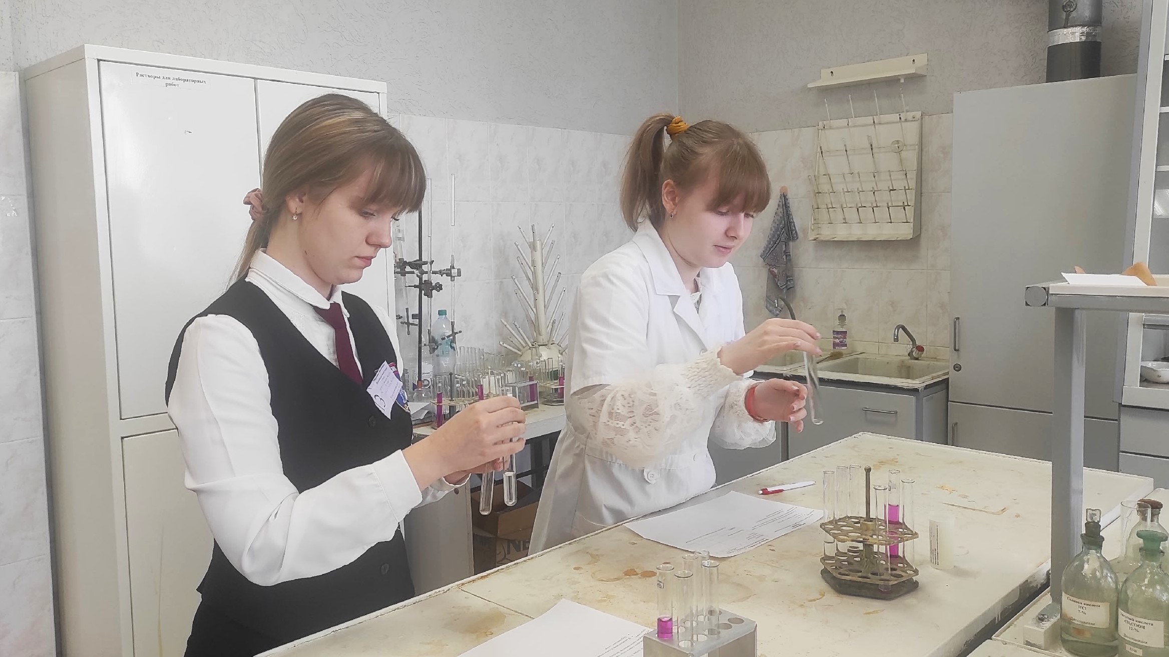При выполнении заданий олимпиады школьникам предстояло не только продемонстрировать теоретические знания по химии при решении задач, но и проявить имеющиеся практические умения и навыки при выполнении опытов в рамках экспериментального тура. Работу участников в лабораториях контролировали профессора и доценты кафедры. На всех этапах мероприятия участников сопровождали волонтеры – студенты второго курса направления «Химическая технология» – члены студенческого научного сообщества СГТУ.