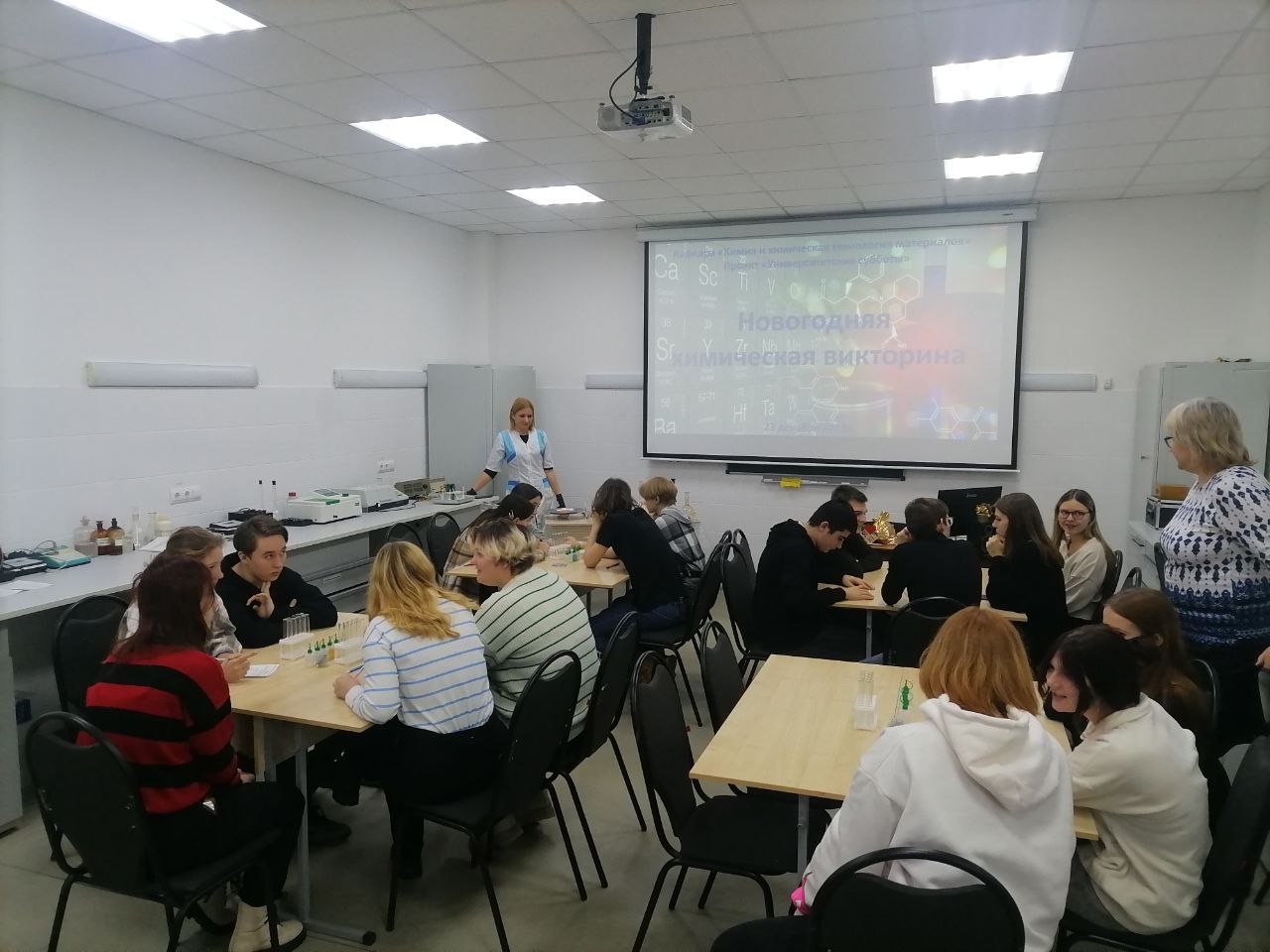 Заместитель директора ФТИ по воспитательной работе, доцент Наталья Ковынева и доцент Татьяна Никитюк провели для гостей экспериментальную новогоднюю химическую викторину. Будущие абитуриенты, разделившись на команды, показали свои знания и эрудицию в области химии, а также продемонстрировали свои навыки при самостоятельном проведении химических экспериментов. Все участники викторины были награждены дипломами и памятными подарками.