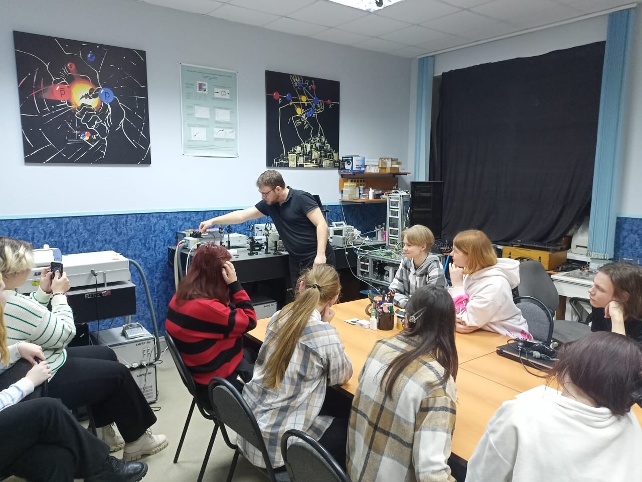 В лаборатории кафедры «Физика» заместитель директора ФТИ по научной работе, доцент Марина Алонова, инженер информационно-аналитического отдела управления научных программ и проектов Сергей Волчков рассказали гостям об оптических методах исследования. Школьникам было продемонстрировано научно-исследовательское оборудование, которое позволяет изучать свойства и структуру веществ и материалов, живых и неживых объектов.