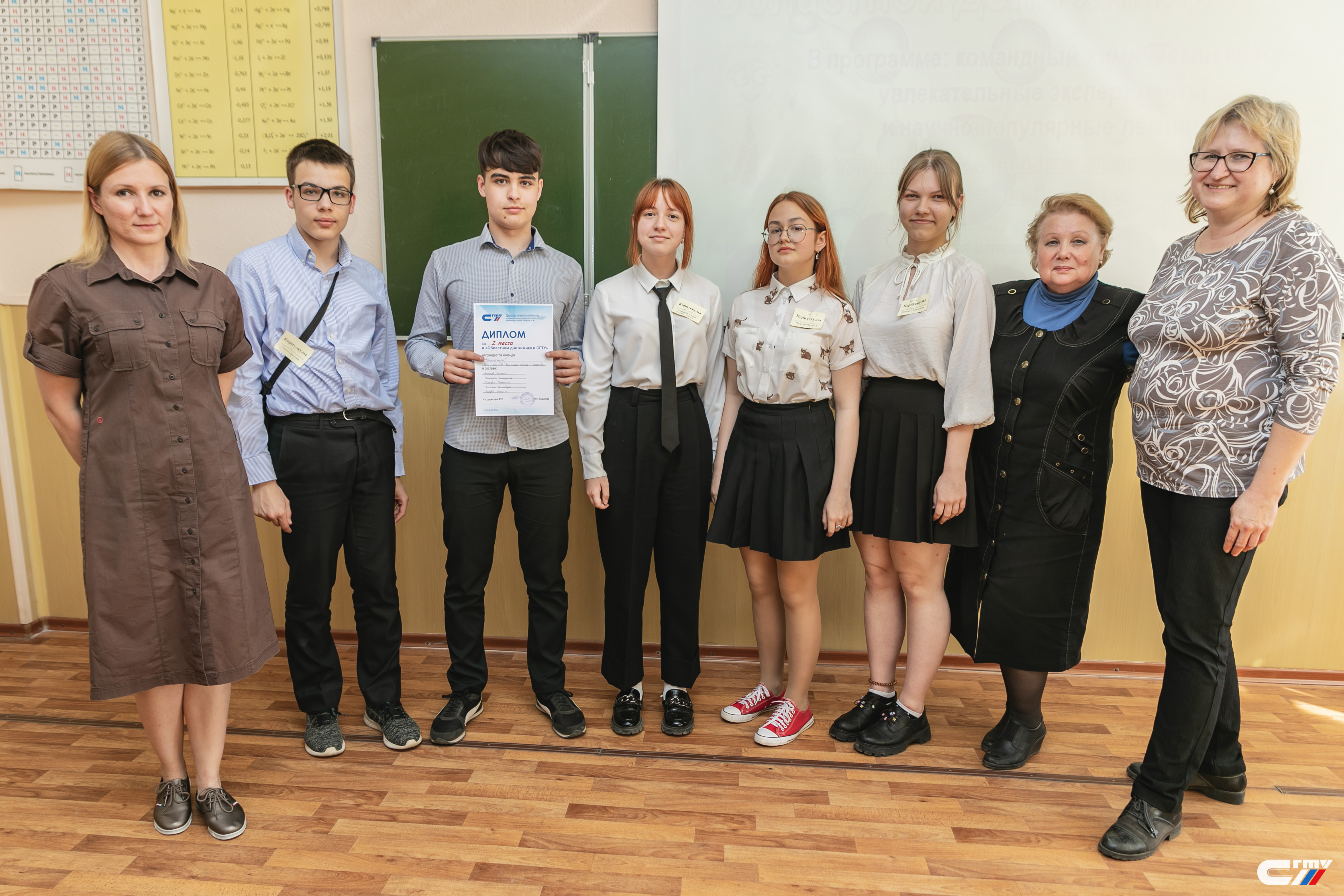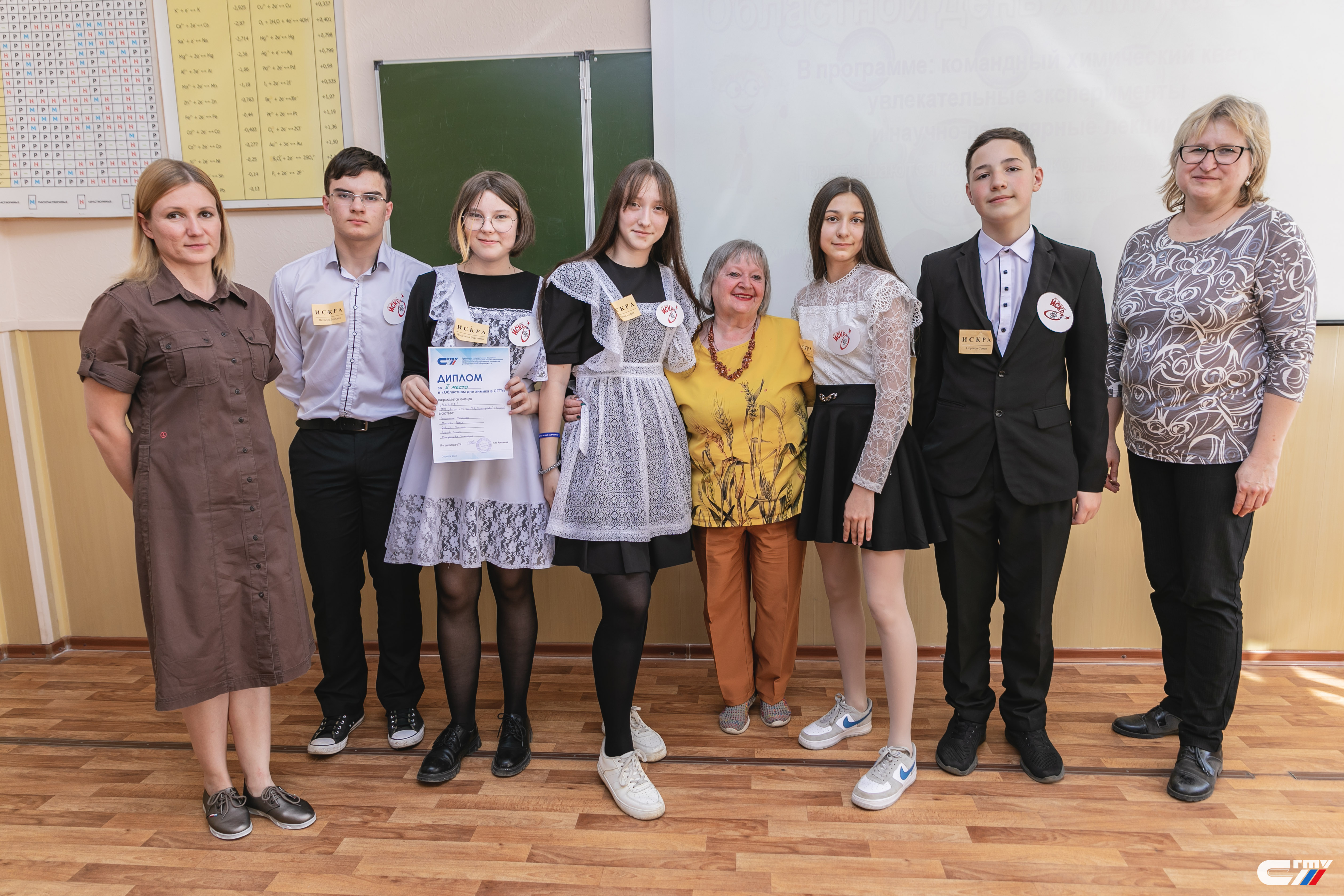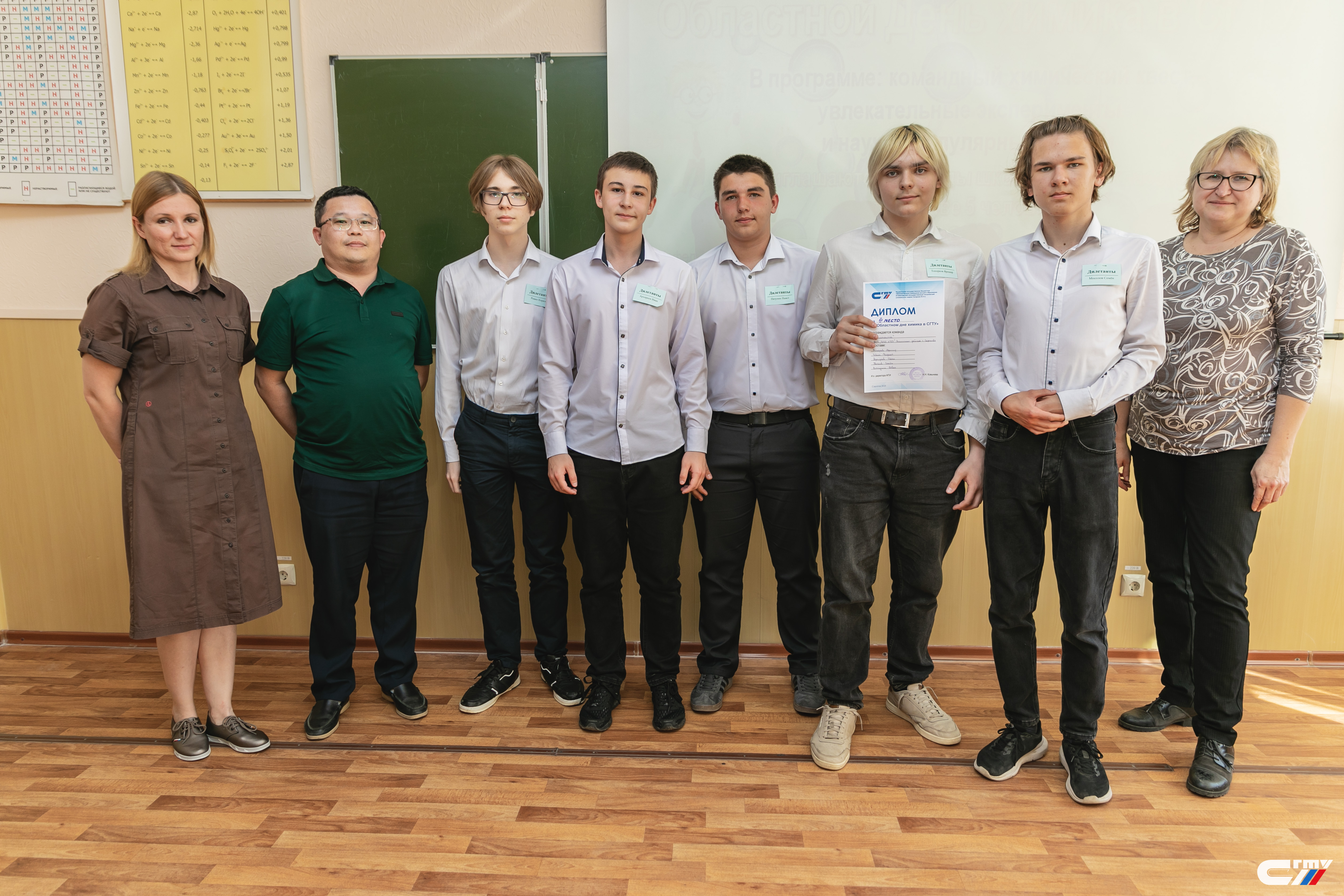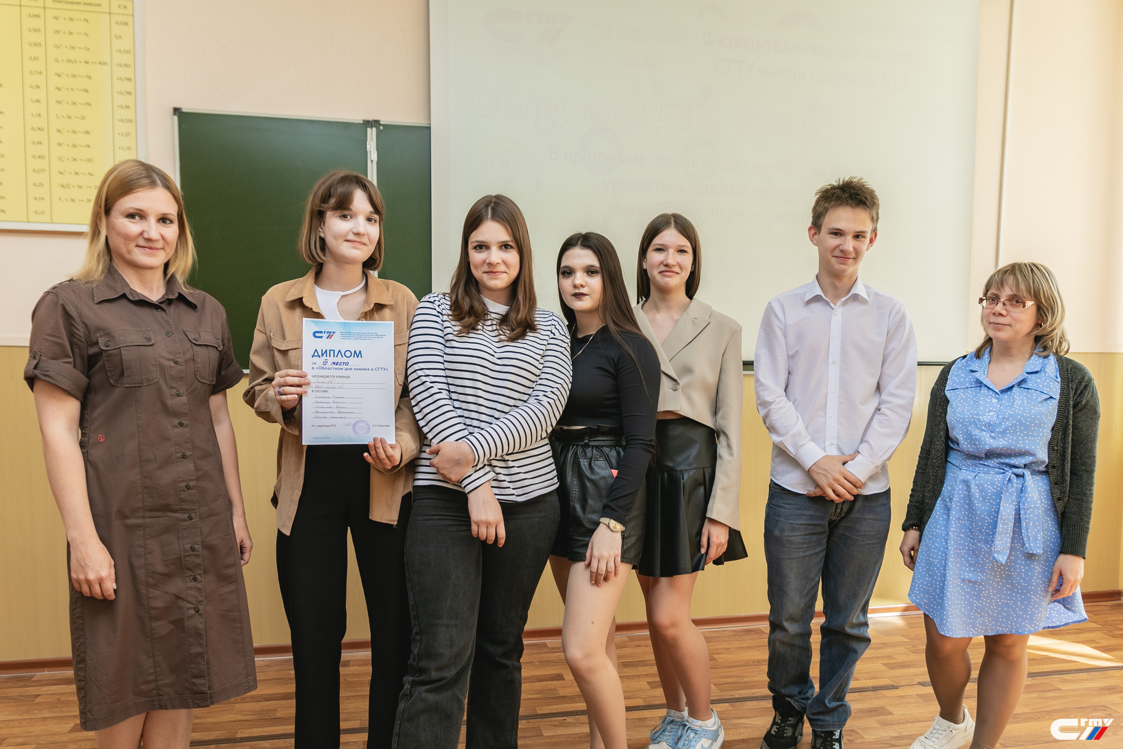 В завершении праздничного мероприятия заместитель директора Физико-технического института Наталья Ковынева поздравила гостей политеха с наступающим профессиональным праздником и вручила дипломы победителям и призерам химического квеста. Лучшими стали команды «Корпускулы» школы №94 Ленинского района Саратова и «Титаны» школы с. Куриловка Новоузенского района Саратовской области.