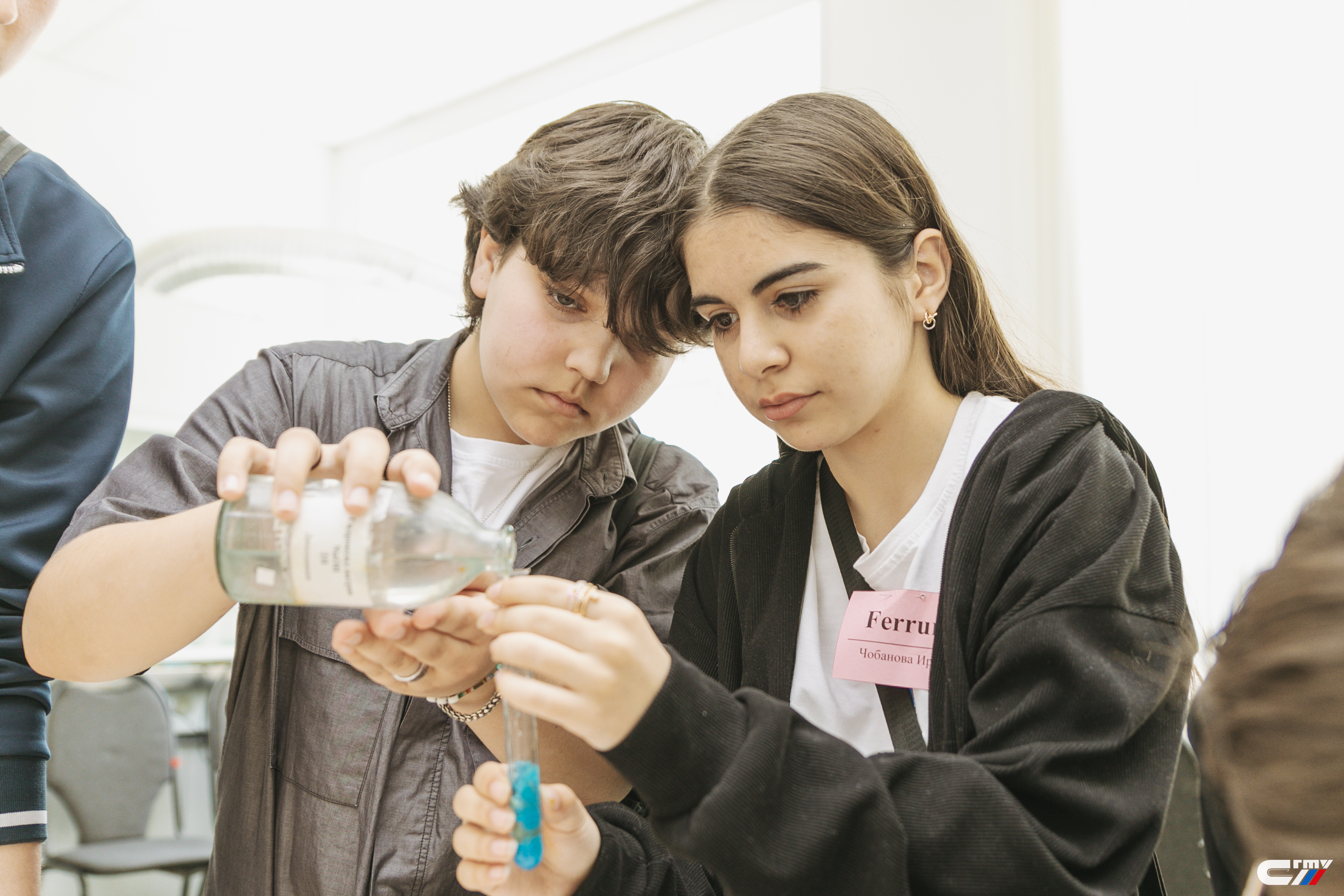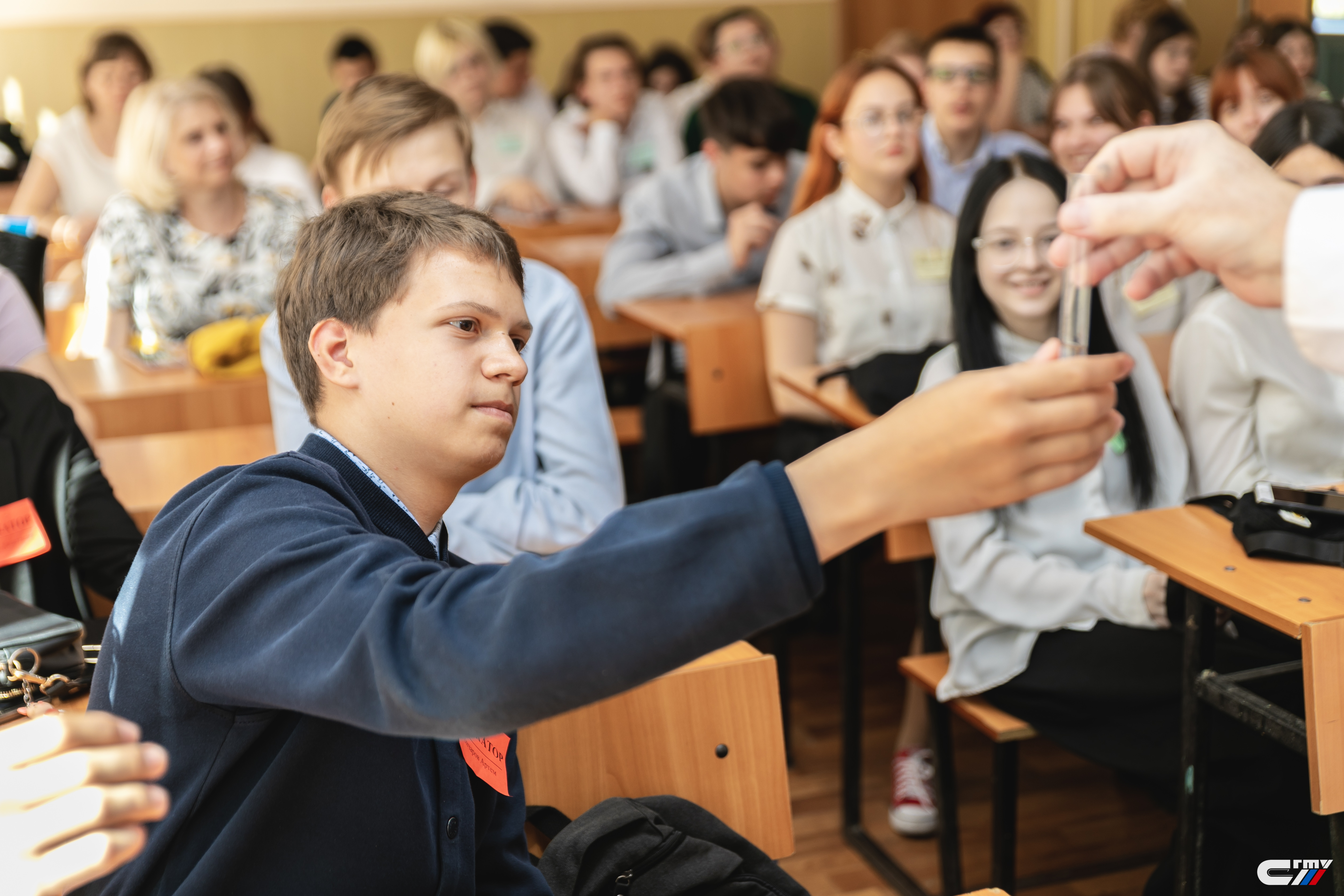 Вместе с профессором кафедры Олегом Растегаевым восьмиклассники вспомнили признаки протекания химических реакций – получили окрашенные растворы и осадки, химические соединения, обладающие запахом.