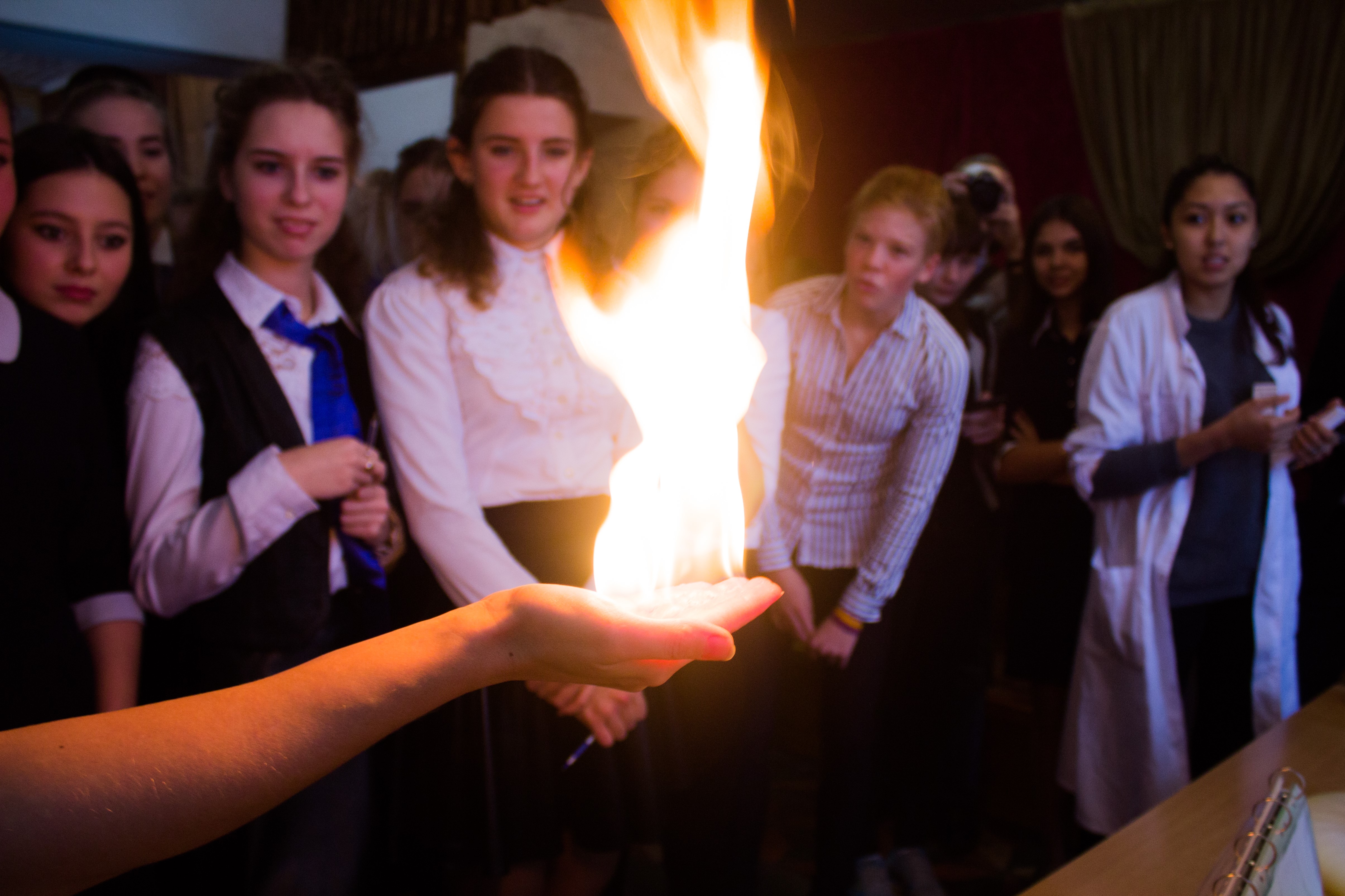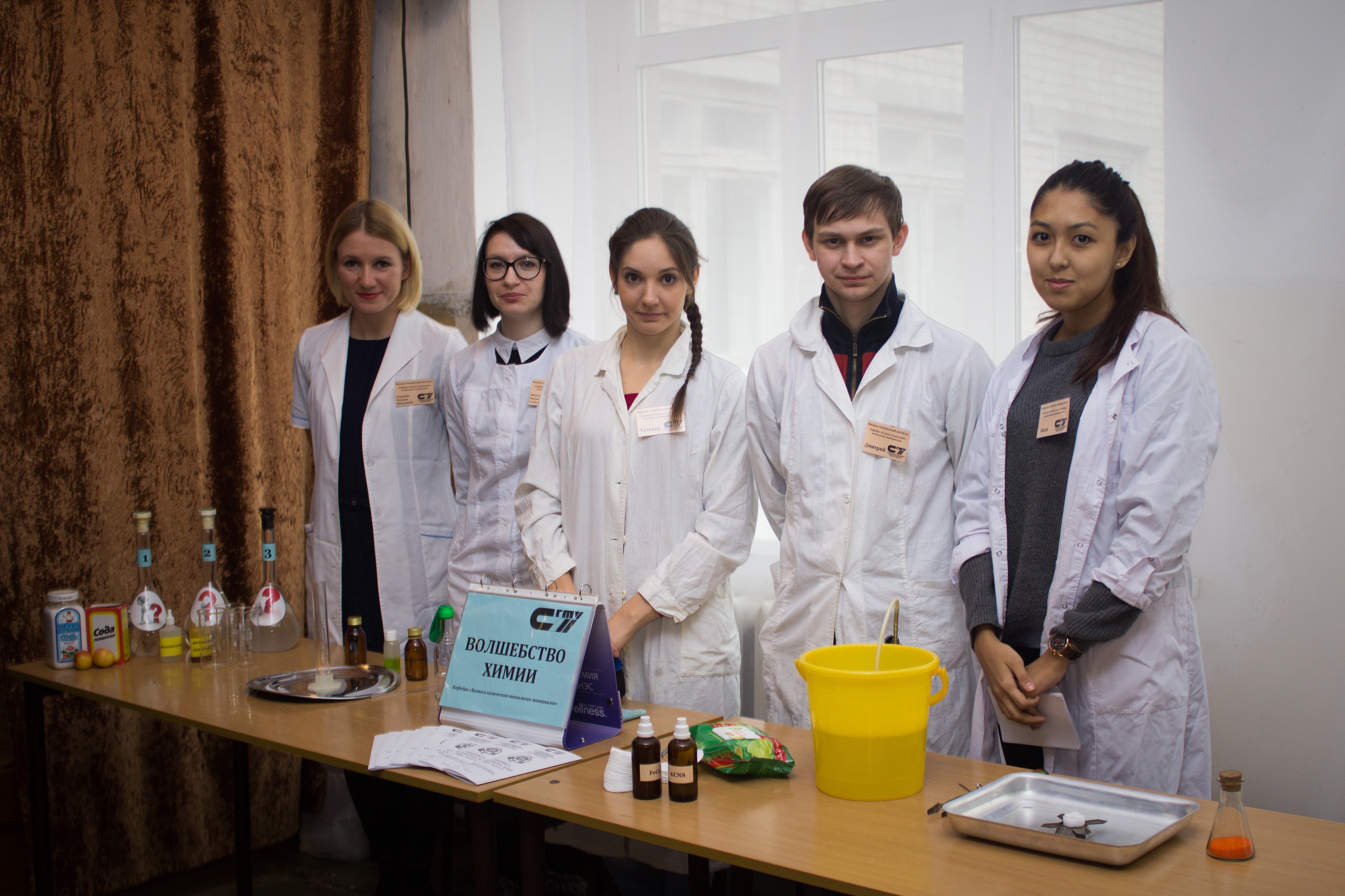 В рамках игры студентами группы б2-ЭРСП41 Аидой Аубекировой, Татьяной Катковой, Дмитрием Токаревым и преподавателями кафедры «Химия и химическая технология материалов» физико-технического института Натальей Ковыневой и Марией Викуловой была проведена викторина «Волшебство химии». Поскольку каждый вопрос сопровождался зрелищным экспериментом, знатоки не только продемонстрировали свои знания и эрудицию, но и смогли увидеть эффектные химические реакции. Гагаринцы показали ребятам, как важно знать законы химии, ведь химики способны на многое – даже заставить гореть на своей ладони мыльную пену. Кроме того, учащиеся узнали много нового о такой важной и востребованной профессии как химик-технолог, которую можно получить в Гагаринском вузе.