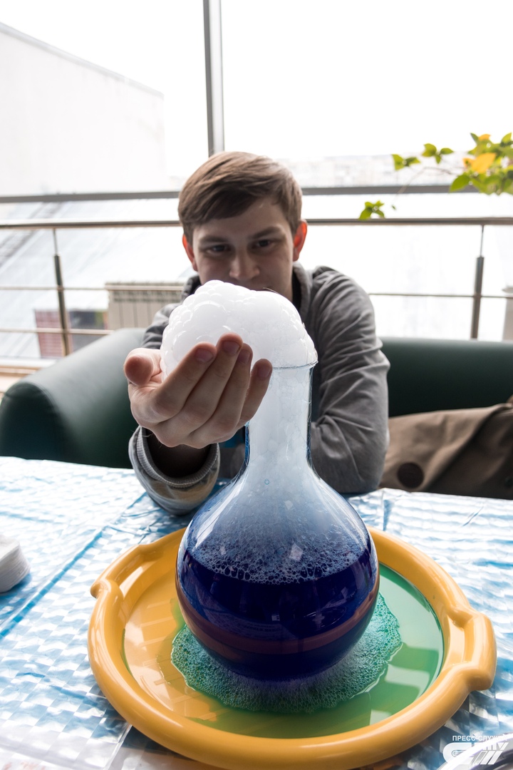 Организованная преподавателями и студентами кафедры ХИМ площадка познакомила знатоков с различными химическими явлениями, развивая при этом познавательную деятельность учащихся. Цветные, изменяющие окраску растворы, колбы, испаряющие густой белый дым, эффектное появление «фараоновых змей», зрелищное «извержение вулкана», горение мыльной пены – все это вызвало у школьников большой интерес и массу положительных эмоций.