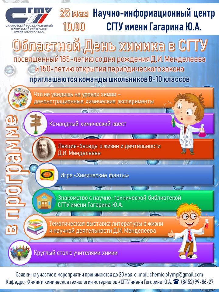 Кафедра «Химия и химическая технология материалов» приглашает учащихся 8-10 классов Саратова и Саратовской области принять участие в праздничном мероприятии «Областной День химика в СГТУ», приуроченном к 185-летию со дня рождения Д.И. Менделеева и 150-летию открытия периодического закона, которое состоится 25 мая 2019 года в Научно-информационном центре СГТУ имени Гагарина Ю.А.