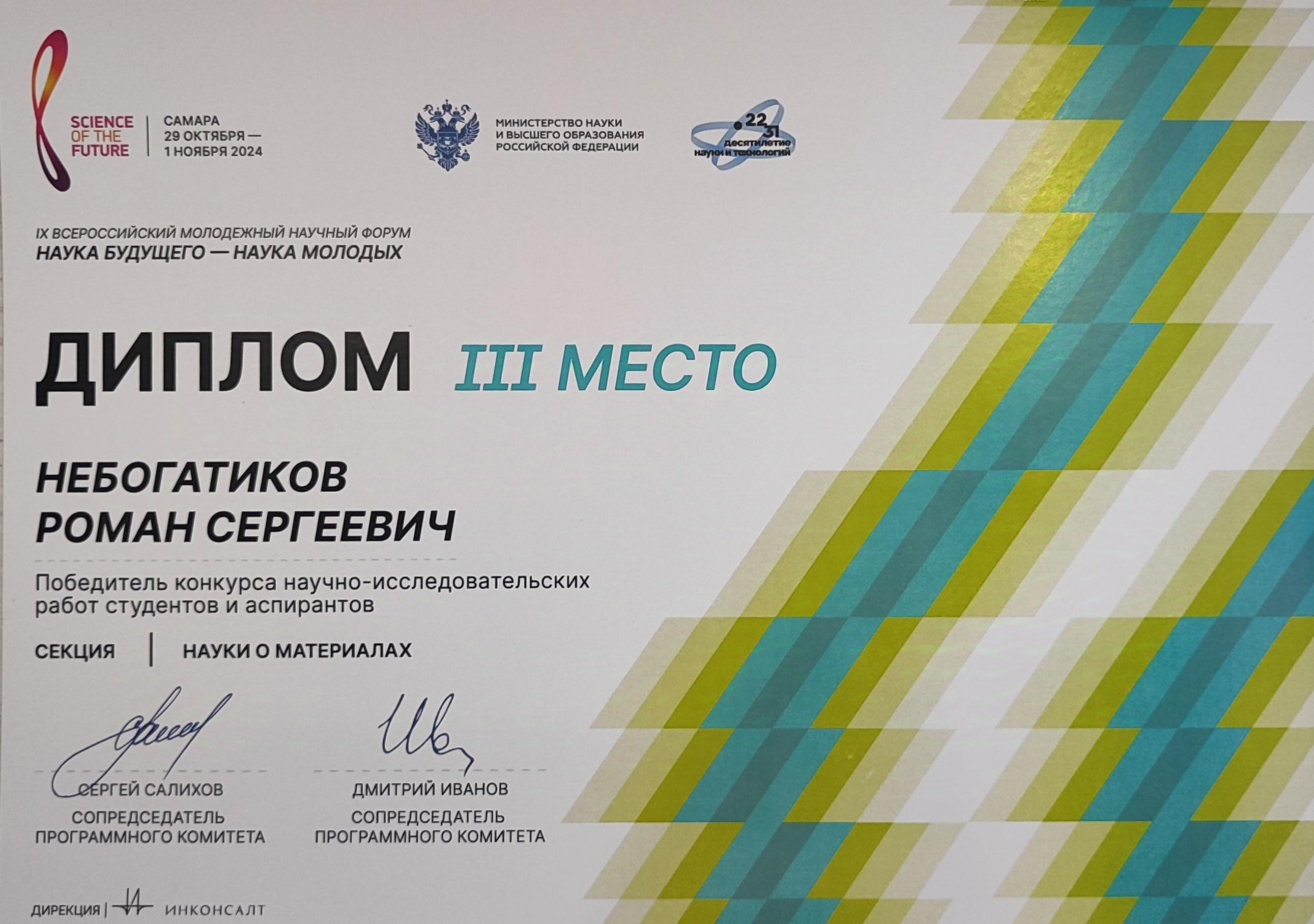 Одной из основных секций была «Науки о материалах», в которой аспирант кафедры «Материаловедение и биомедицинская инженерия» Института машиностроения, материаловедения и транспорта СГТУ имени Гагарина Ю.А. Роман Небогатиков занял 3 место с темой «Исследование структуры и свойств биосовместимого PVD-покрытия SiO2-Cr2O3 на керамической основе Y-TZP». Его победа является официальным признанием высокого уровня профессиональной и научной квалификации.