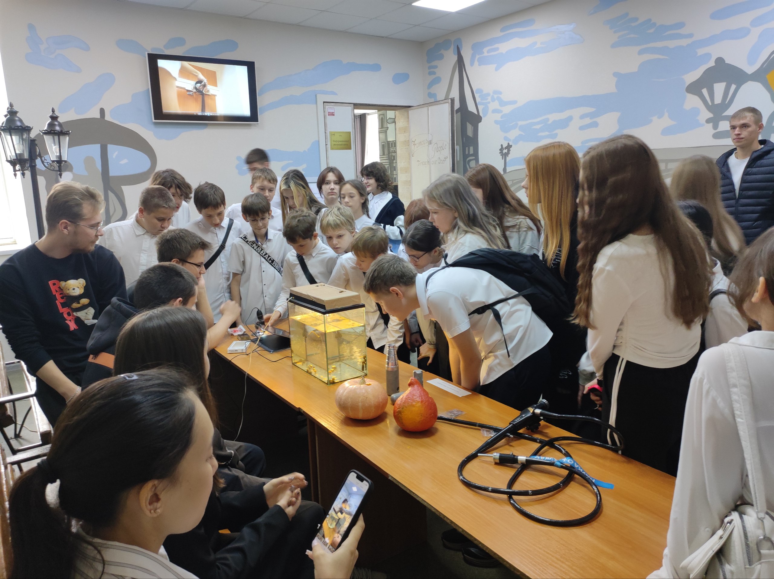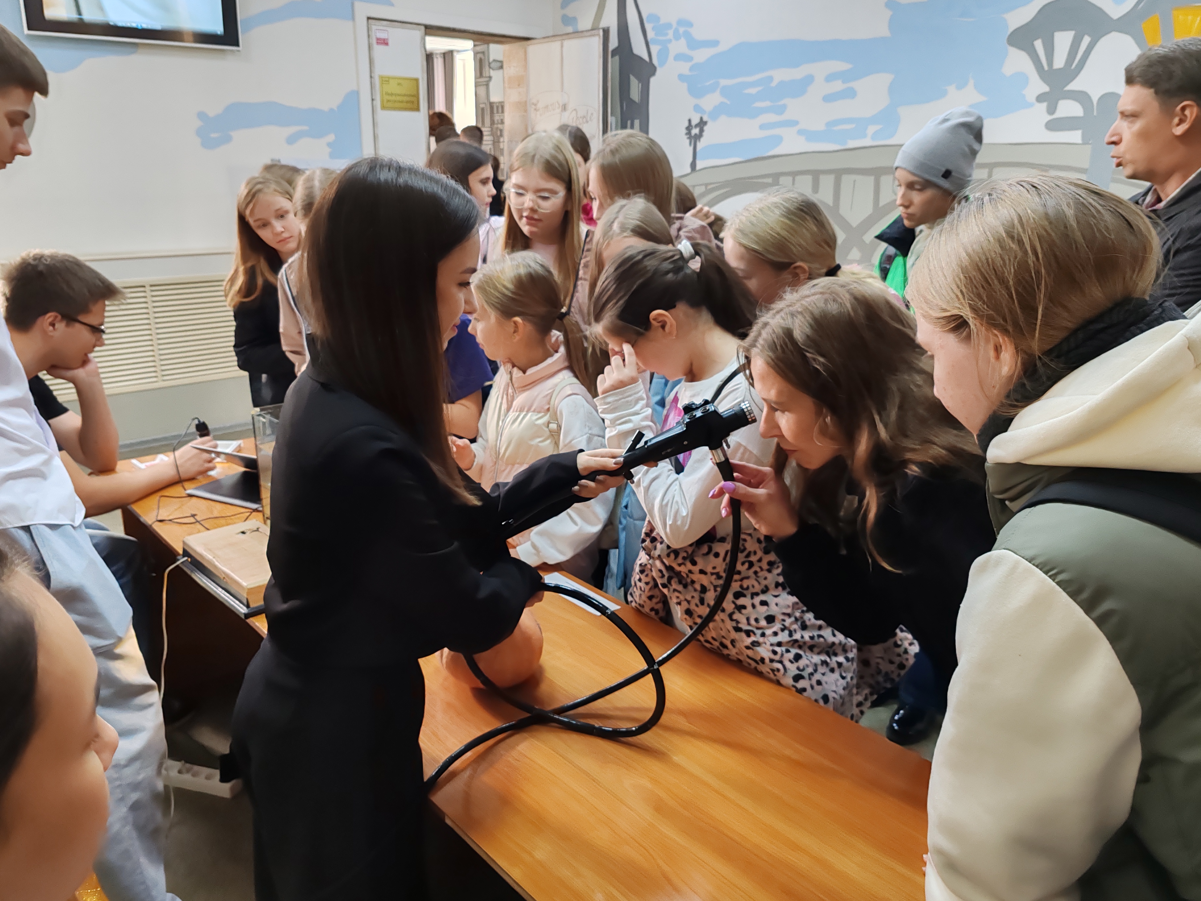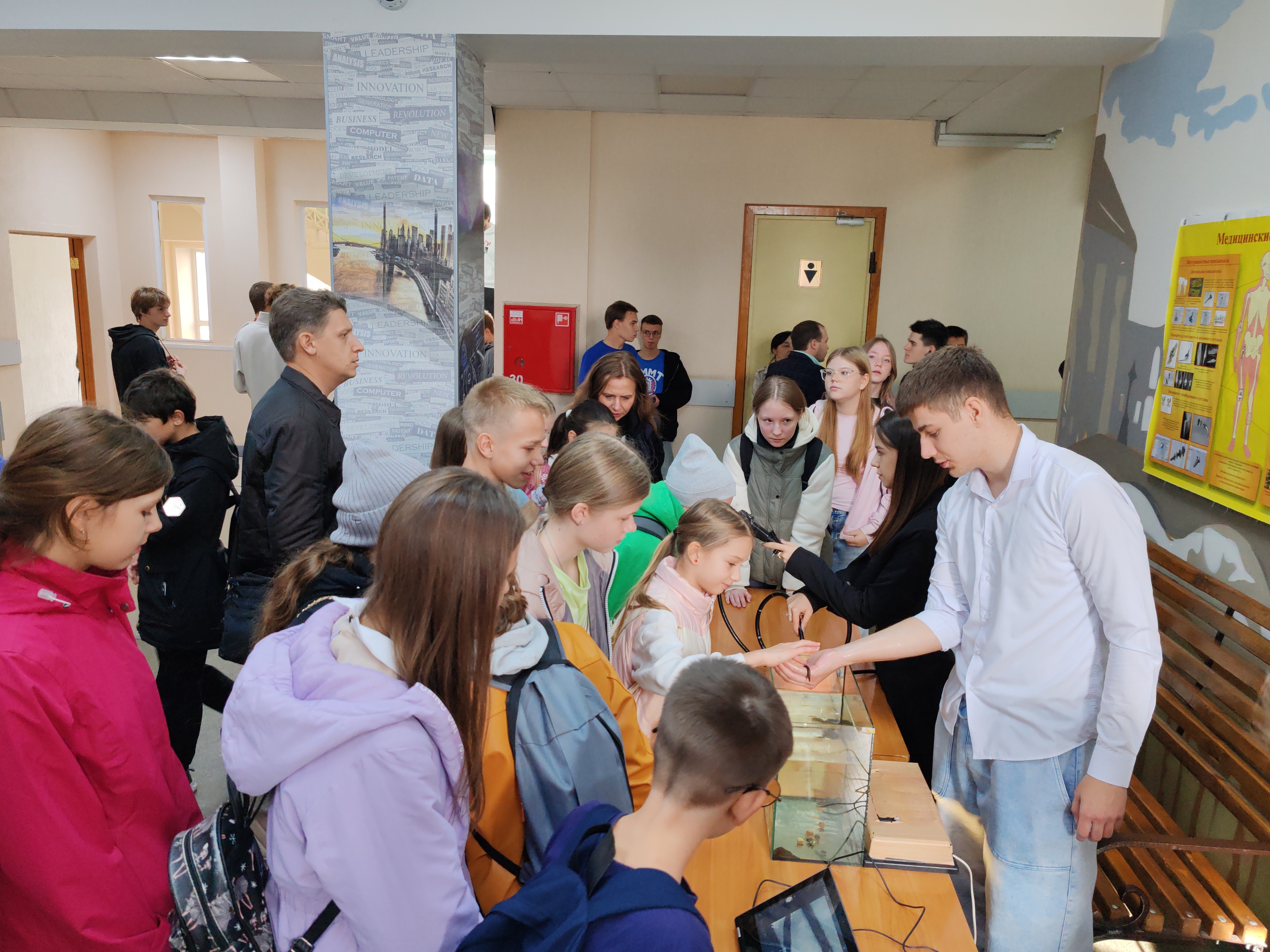Часть экспозиции располагалась в фойе Института машиностроения, материаловедения и транспорта. Сотрудники кафедры и студенты-выпускники группы б-БИСТ-41 продемонстрировали школьникам работу медицинской техники. Гости фестиваля смогли лично управлять медицинским эндоскопом, узнать о принципах работы световодов и даже пообщаться с живыми «лекарями» – медицинскими пиявками, о чьих свойствах захватывающе рассказывал профессор Сергей Пичхидзе.