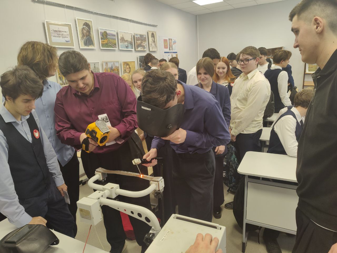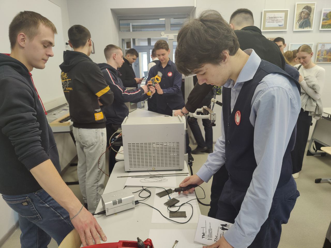 В практической части мастер-класса школьники выполняли задания на оборудовании для контактной сварки и отработали базовые навыки на сварочном дуговом малоамперном тренажёре, а также познакомились с работой оборудования ультразвуковой очистки, тепловизора и электроискрового карандаша.