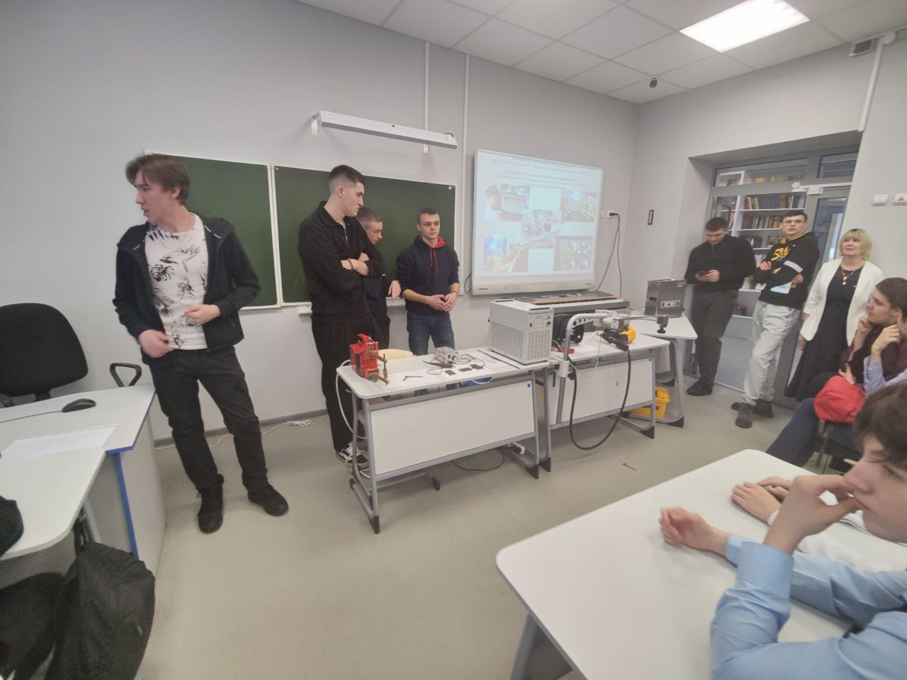 Научно-практическая часть программы превратил аудиторию в настоящую лабораторию. Студенты 3 курса направлений «Лазерная техника и лазерные технологии» и «Машиностроение» Владислав Бойчук, Кристина Бруева, Ростом Гарцкия, Никита Кузнецов, Евгений Казуров, Матвей Воробьёв познакомили ребят с эффектом кавитация, с физическими процессами формирования неразъемного соединения металлов точечной контактной сваркой, с термограммой изучения тепловых изображений и с методом электроискровой обработки материалов. Школьники подробно изучили процесс возникновения электрической дуги, которая образуется между металлическим электродом и основным металлом при протекании электрического тока и физические принципы образования и поддержания дуги, а также узнали о разнообразных видах электродуговой сварки и области ее применения в машиностроительном производстве.