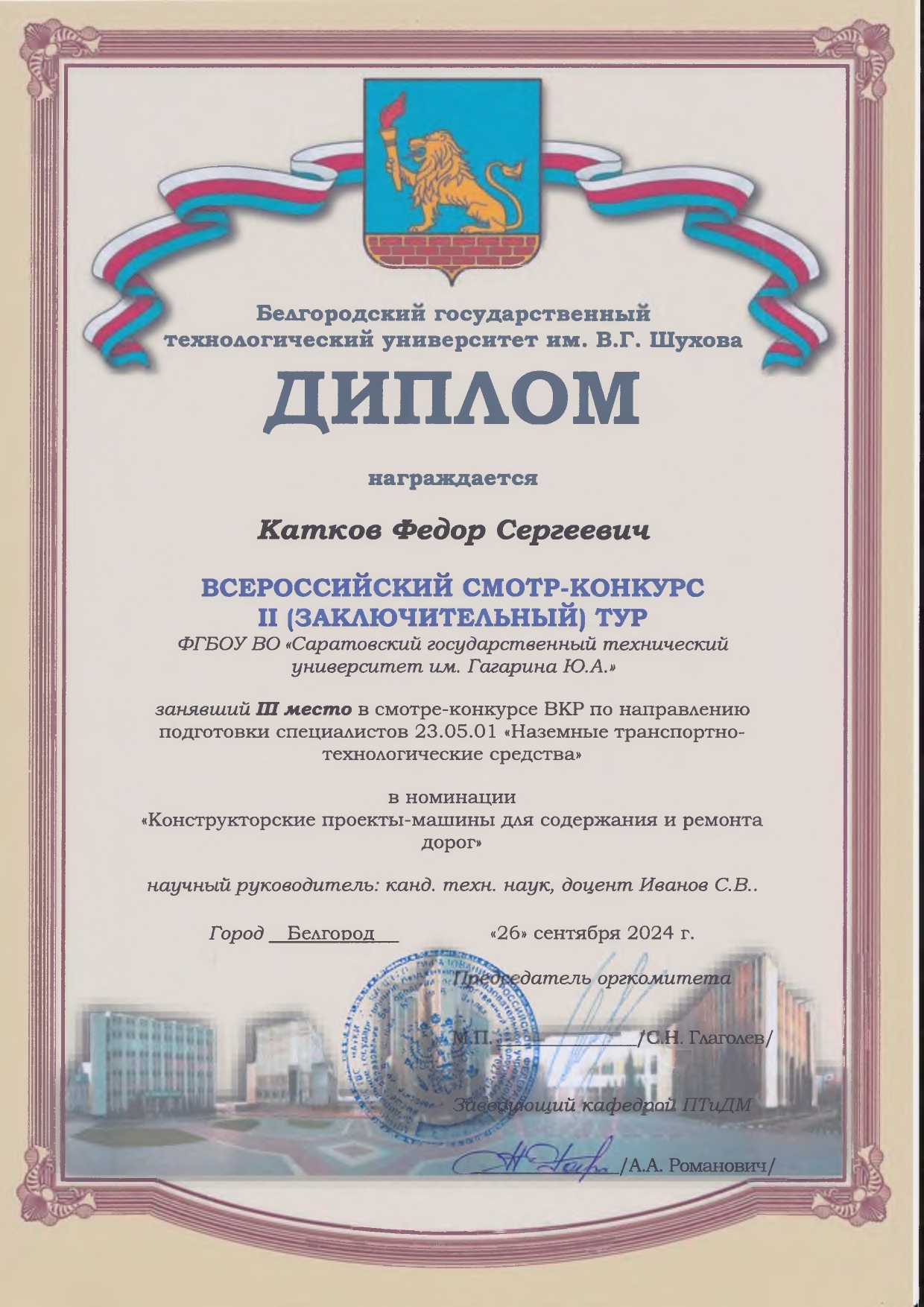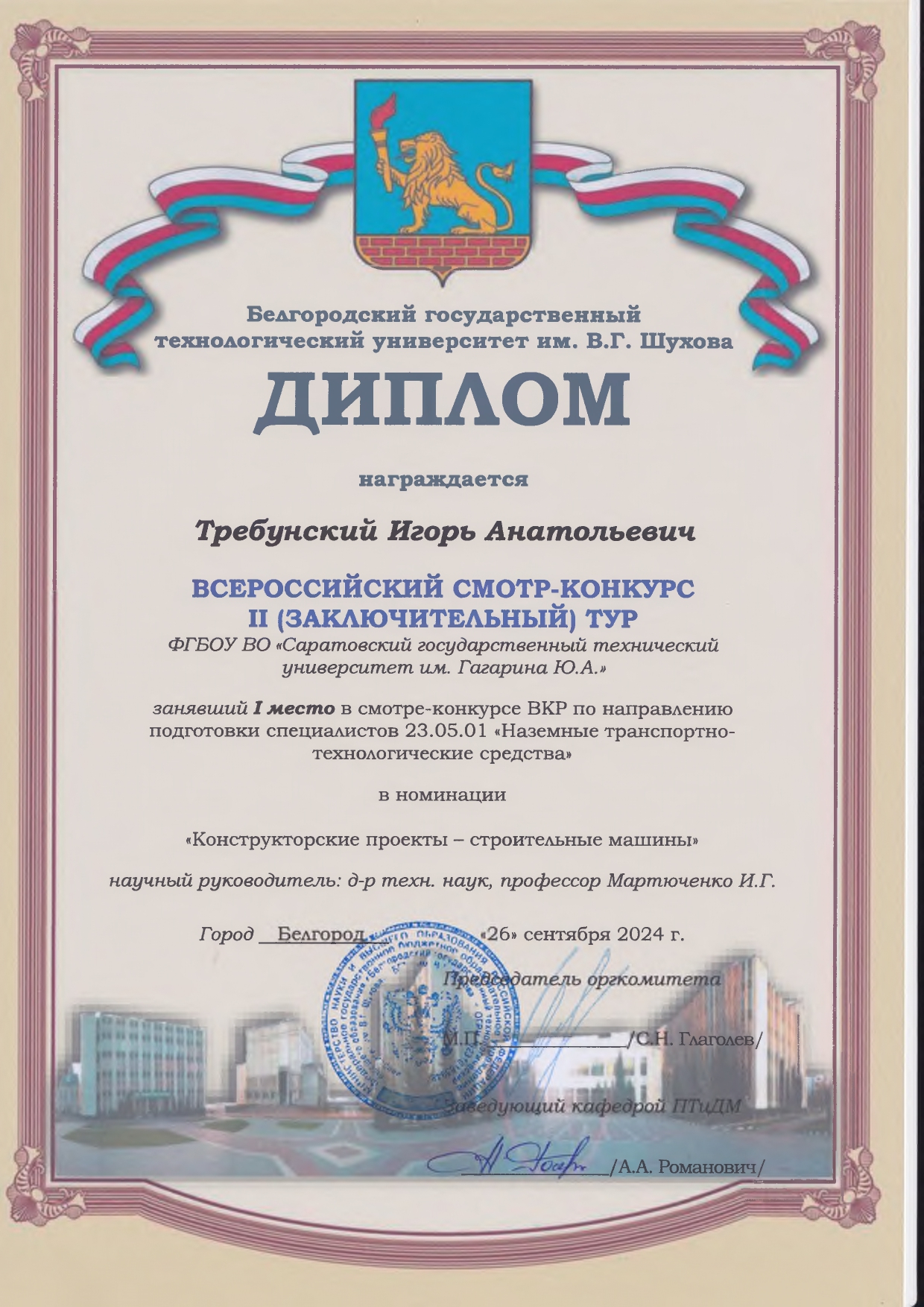 В сентябре на базе кафедры «Подъемно-транспортных и дорожных машин» Белгородского государственного технического университета им. В.Г. Шухова прошел заключительный тур Всероссийского смотра-конкурса выпускных квалификационных работ по специальности «Наземные транспортно-технологические средства (НТС)» (специализация – «Подъемно-транспортные, строительные, дорожные средства и оборудование»).