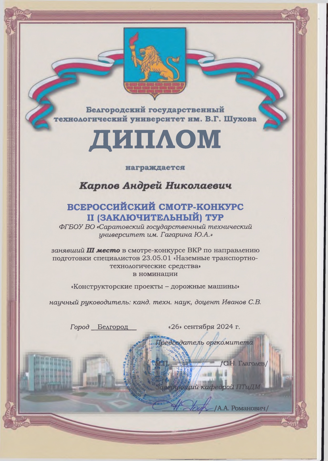 Андрей Карпов – 3 место в номинации «Конструкторские проекты – дорожные машины», тема «Оборудование для планировки и уплотнения грунтовых оснований автомобильных дорог» (научный руководитель – к.т.н., доцент Сергей Иванов);