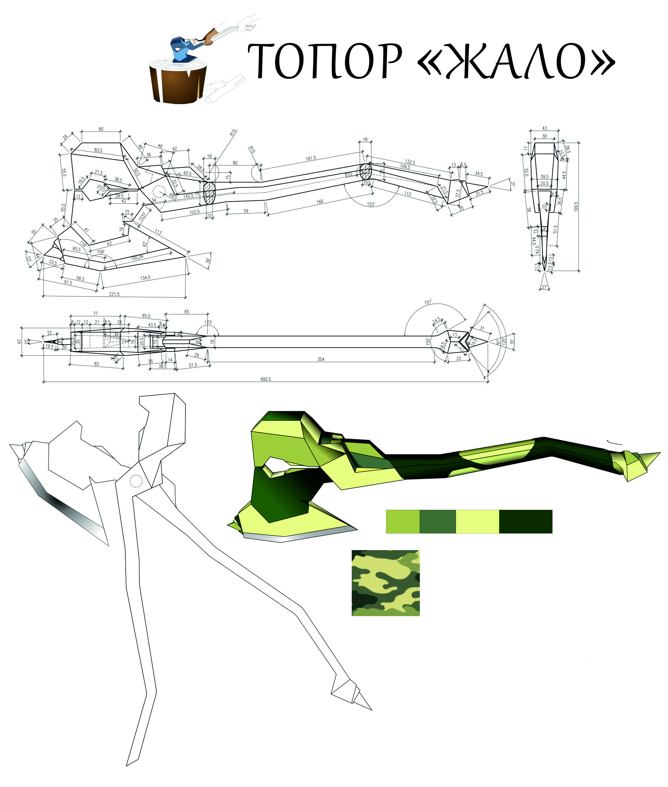 Многофункциональный ручной инструмент - топор «Жало». Данная модель обладает повышенной комфортностью и эффективностью при использовании, расширенной функциональностью инструмента, сочетающего в себе функции топора, резака, ключа, захвата, лома и кувалды. (Автор – студент ДИЗН – 31 Журавлев А.О.)
