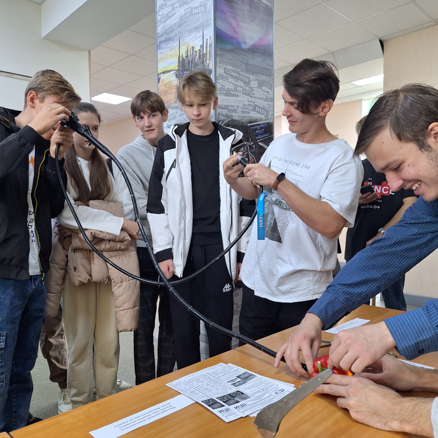 Основная экспозиция располагалась в фойе Института машиностроения, материаловедения и транспорта. Ассистент кафедры Надежда Андриянова при помощи студентов кафедры продемонстрировали школьникам работу медицинского эндоскопа, рассказали о работе световодов и особенностях конструирования медицинской техники. Живой интерес посетителей вызвал аквариум с медицинскими пиявками, про лечебные свойства которых рассказал профессор Сергей Пичхидзе.