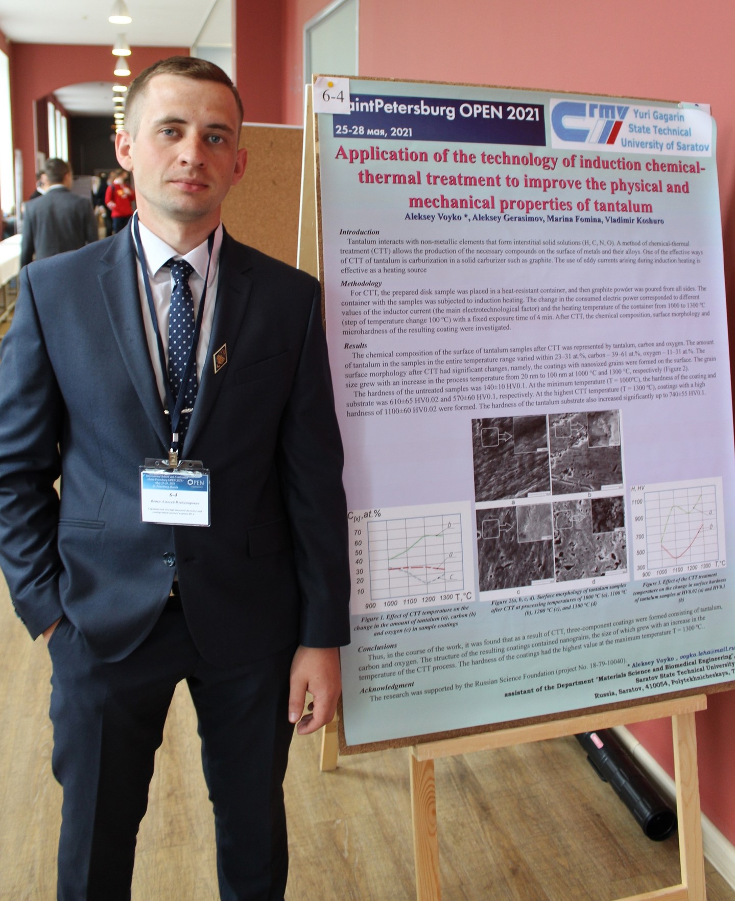 Доцент кафедры «Материаловедение и биомедицинская инженерия» Александр Шумилин, аспиранты Андрей Щелкунов и Алексей Войко представили результаты своих научных работ в рамках конкурсной программы конференции. Все представленные доклады получили высокую оценку именитой конкурсной комиссии и были рекомендованы для опубликования в виде расширенных статей в журнале «Journal of Physics: Conference Series» (индексируется в базах SCOPUS и Web of Science) издательства IOP (Великобритания). По итогам устной и стендовой сессии из более чем 270 докладов были определены 23 лучшие работы аспирантов и молодых ученых (до 35 лет). В число победителей вошли также доклады Андрея Щелкунова на тему «Study of the hardness distribution after induction heat treatment of titanium over the surface and the cross-section» и Алексея Войко на тему «Enhancing the physical and mechanical properties of tantalum by induction chemical thermal treatment».