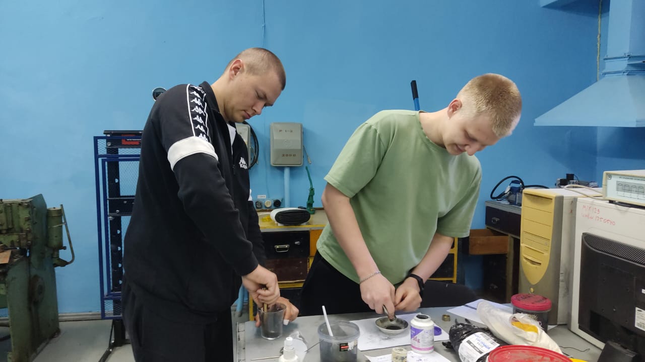 На базе АО «НПП «Алмаз» Максим Лавров и Иван Пустоведов разрабатывают темы выпускных квалификационных работ, посвященные исследованию технологии изготовления электродов из листового гафния и технологии химико-термической обработки титановых изделий.