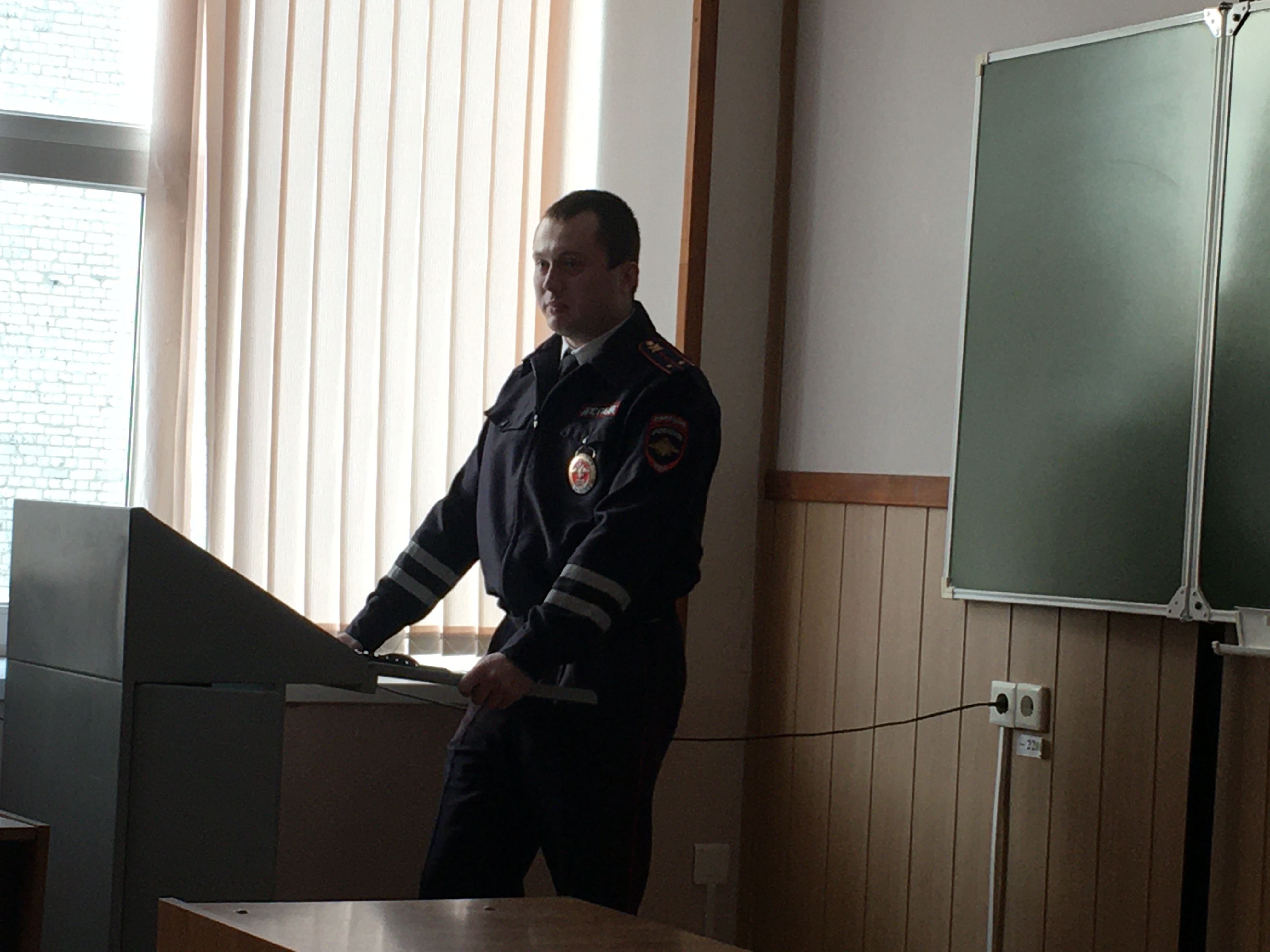 Инспектор отделения организации службы полка ДПС Илья Макаров, выпускник кафедры «Организация перевозок и управление на транспорте» по профилю «Безопасность дорожного движения», прочитал лекцию об основных аспектах работы сотрудников полка ДПС.