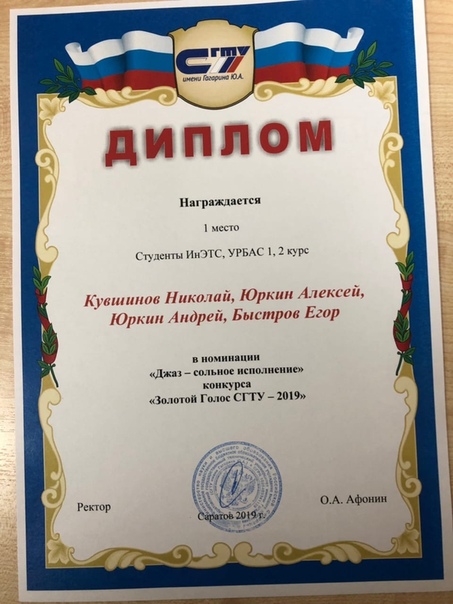 1 место в номинации «Джаз - сольное исполнение» - Кувшинов Николай (б1-ЭТТК21), Юркин Алексей, Юркин Андрей, Быстров Егор