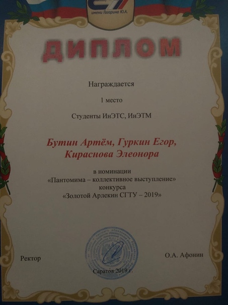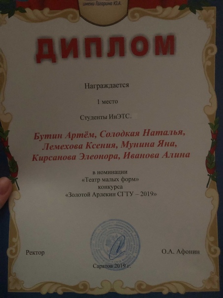Подведены итоги конкурса театрального искусства и оригинального жанра "Золотой Арлекин - 2019" в студклубе СГТУ, где участники от ИнЭТС достойно проявили себя и были награждены грамотами!