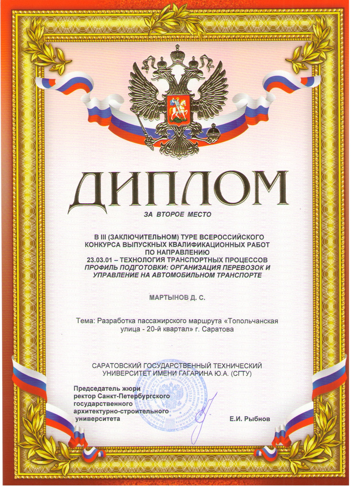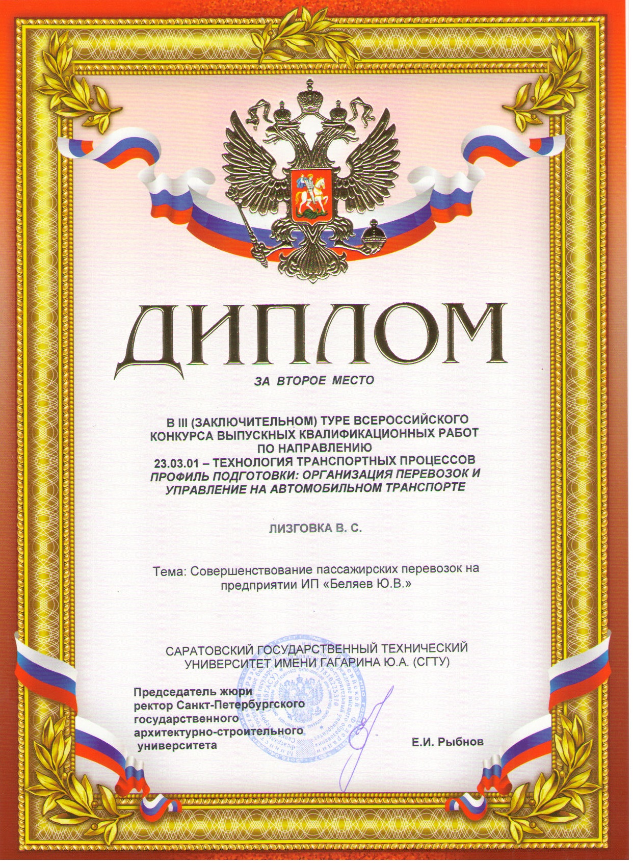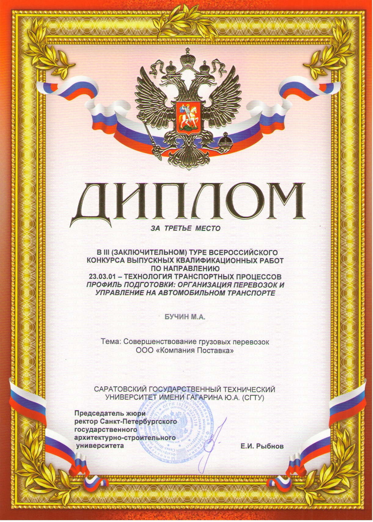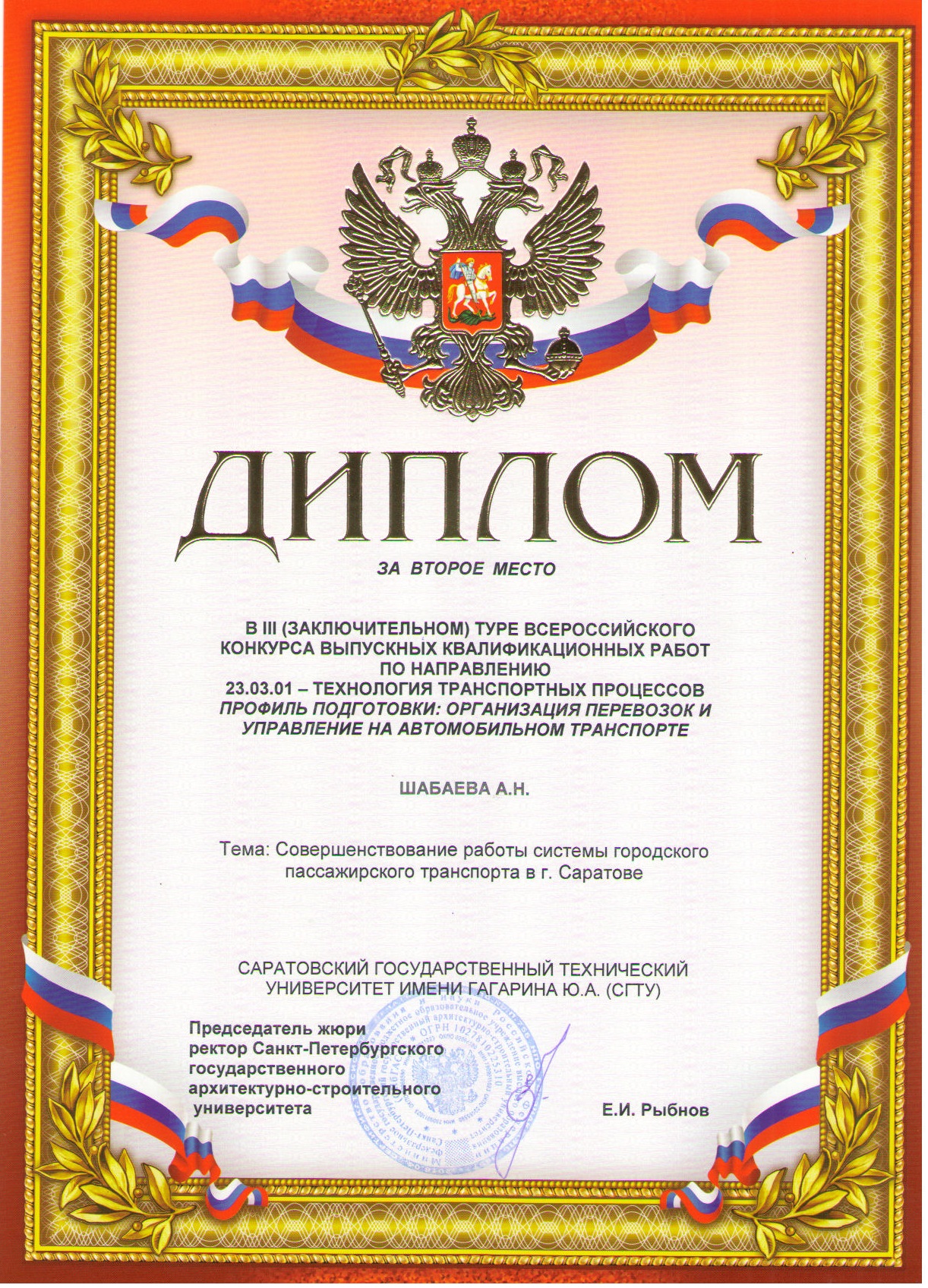 В ноябре 2017 года на базе Санкт-Петербургского государственного архитектурно-строительного университета состоялся III (заключительный) тур Всероссийского смотра-конкурса выпускных квалификационных работ подготовки бакалавров по направлению 23.03.01–Технология транспортных процессов профиль подготовки «Организация перевозок и управление на транспорте».