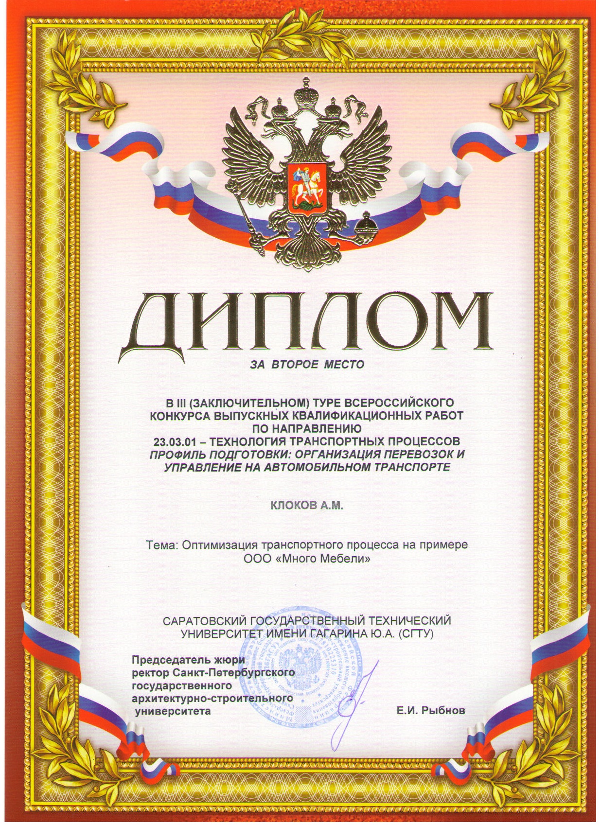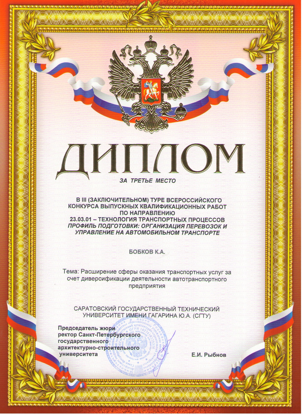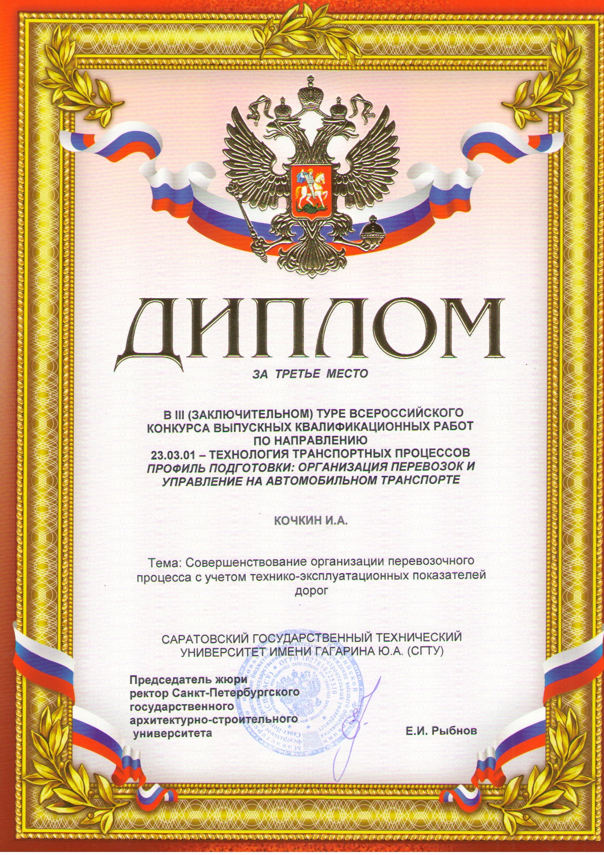 В ноябре 2017 года на базе Санкт-Петербургского государственного архитектурно-строительного университета состоялся III (заключительный) тур Всероссийского смотра-конкурса выпускных квалификационных работ подготовки бакалавров по направлению 23.03.01–Технология транспортных процессов профиль подготовки «Организация перевозок и управление на транспорте».