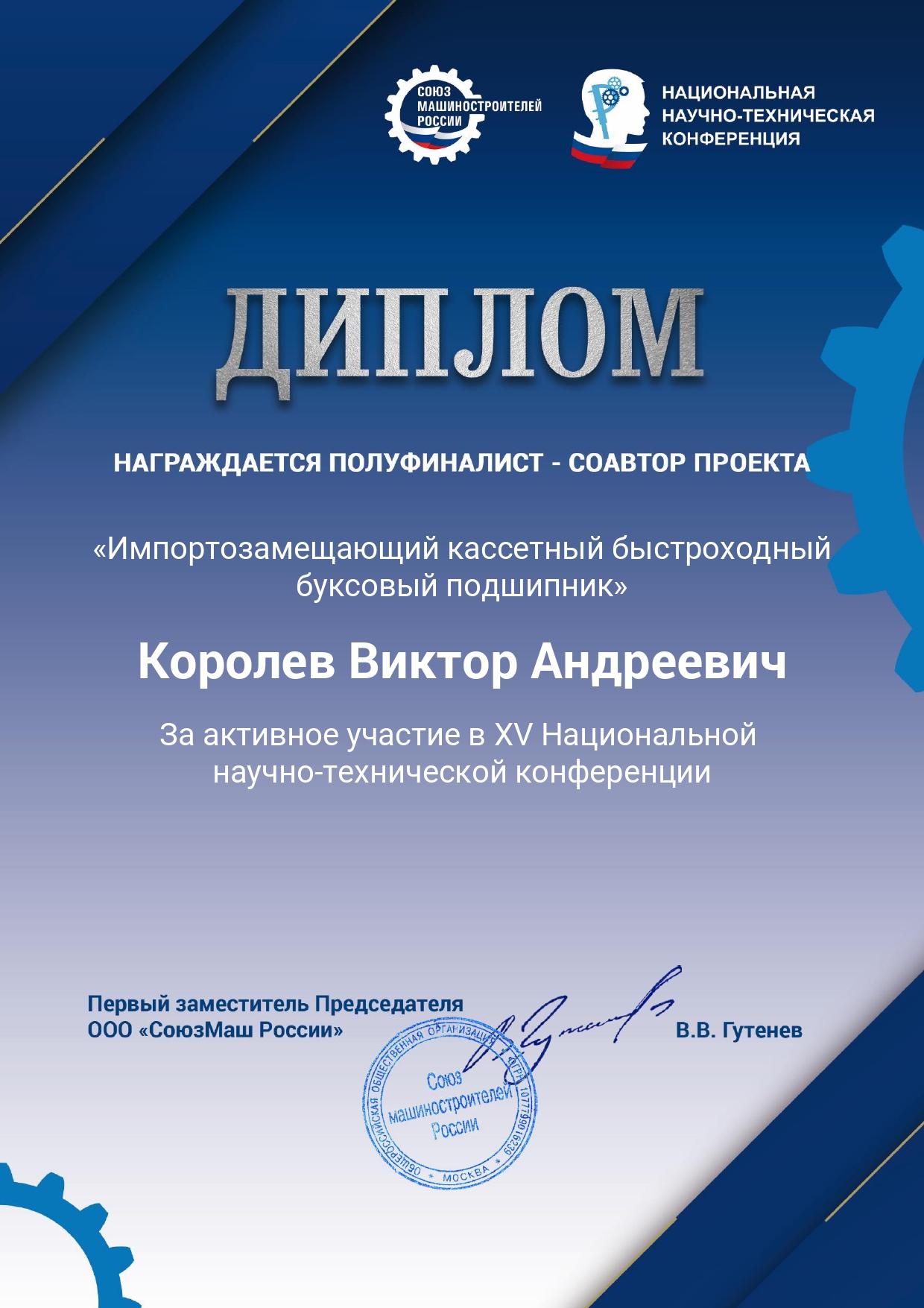 Аспирант кафедры ТМС Королева Анастасия Андреевна и студент 3 курса направления бКТОП кафедры ТМС Королев Виктор Андреевич достойно представили кафедру на XV Национальной научно-технической конференции Союза машиностроителей России. В рамках мероприятия их проектная работа вошла в полуфинал и была награждена дипломами полуфиналиста. Тема исследования: «Импортозамещающий кассетный быстрходный буксовый подшипник».