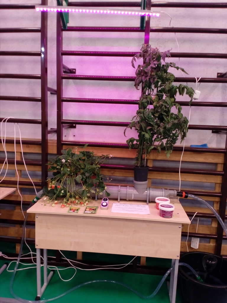 Главным экспонатом выставки была представленная доц. А.В.Цыганковым действующая модель «Автоматизированная гидропонная установка» с живыми плодоносящими культурными растениями: полутораметровым кустом томата с плодами и двумя кустами садовой ремонтантной земляники с множеством спелых ягод.