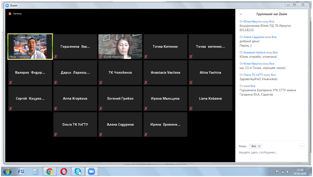 7 апреля 2020 года лидер Точки кипения СГТУ Екатерина Горшенина приняла участие в онлайн-встрече «Жизнь города до и после открытия Точки кипения: обмен опытом» (ВКС для команд Точек кипения).