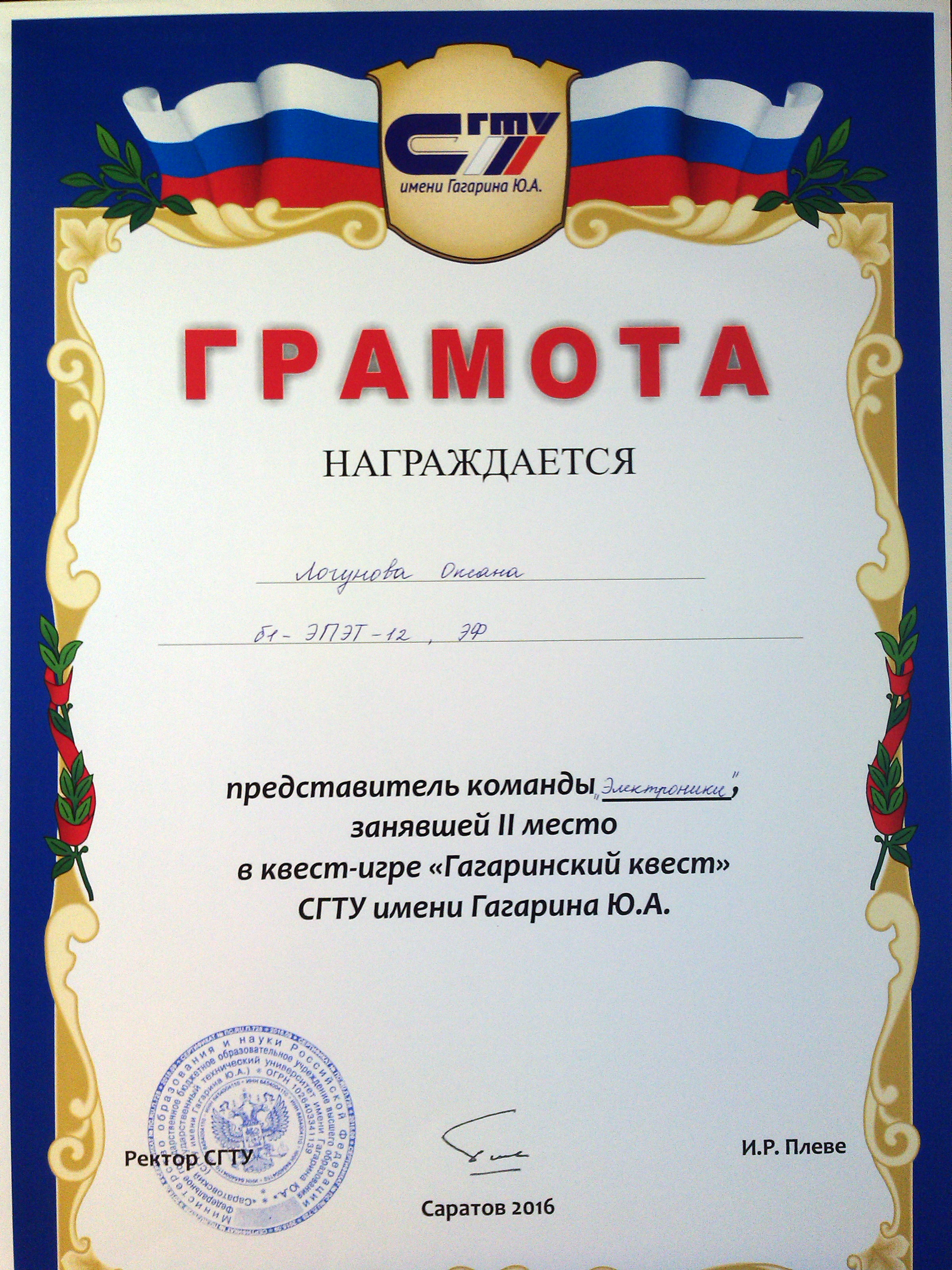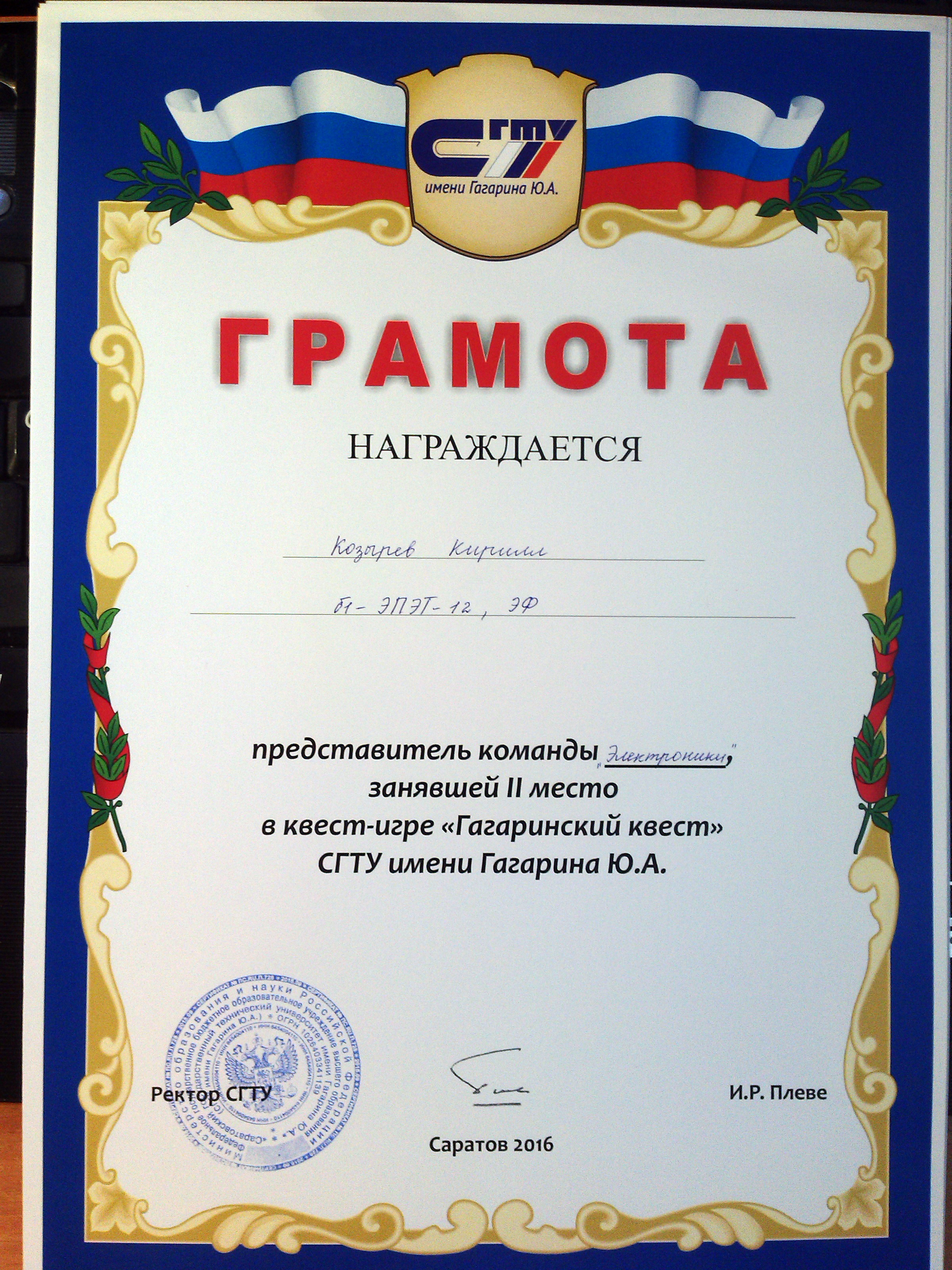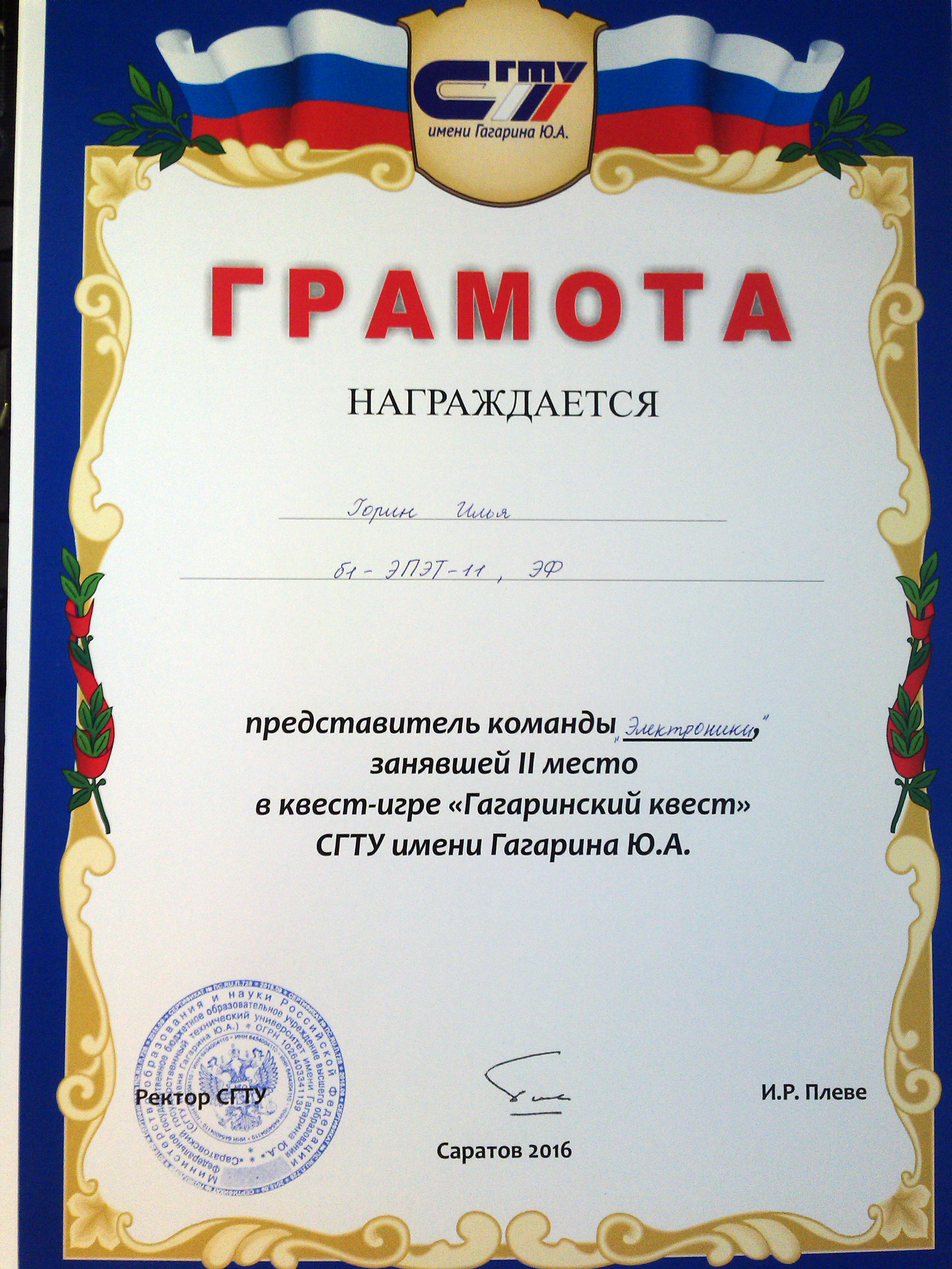 23 марта 2016 года в СГТУ прошел Гагаринский квест. Участниками данного квеста были студенты первокурсники. По итогам игры студенты энергетического факультета команды «Электроник»: Иванилов Илья гр. б1элэт-12, Горин Илья гр. б1элэт-11, Козырев Кирилл гр. б1элэт-12, Логунова Оксана гр. б1элэт-12 заняли почетное 2 место. Поздравляем!!!