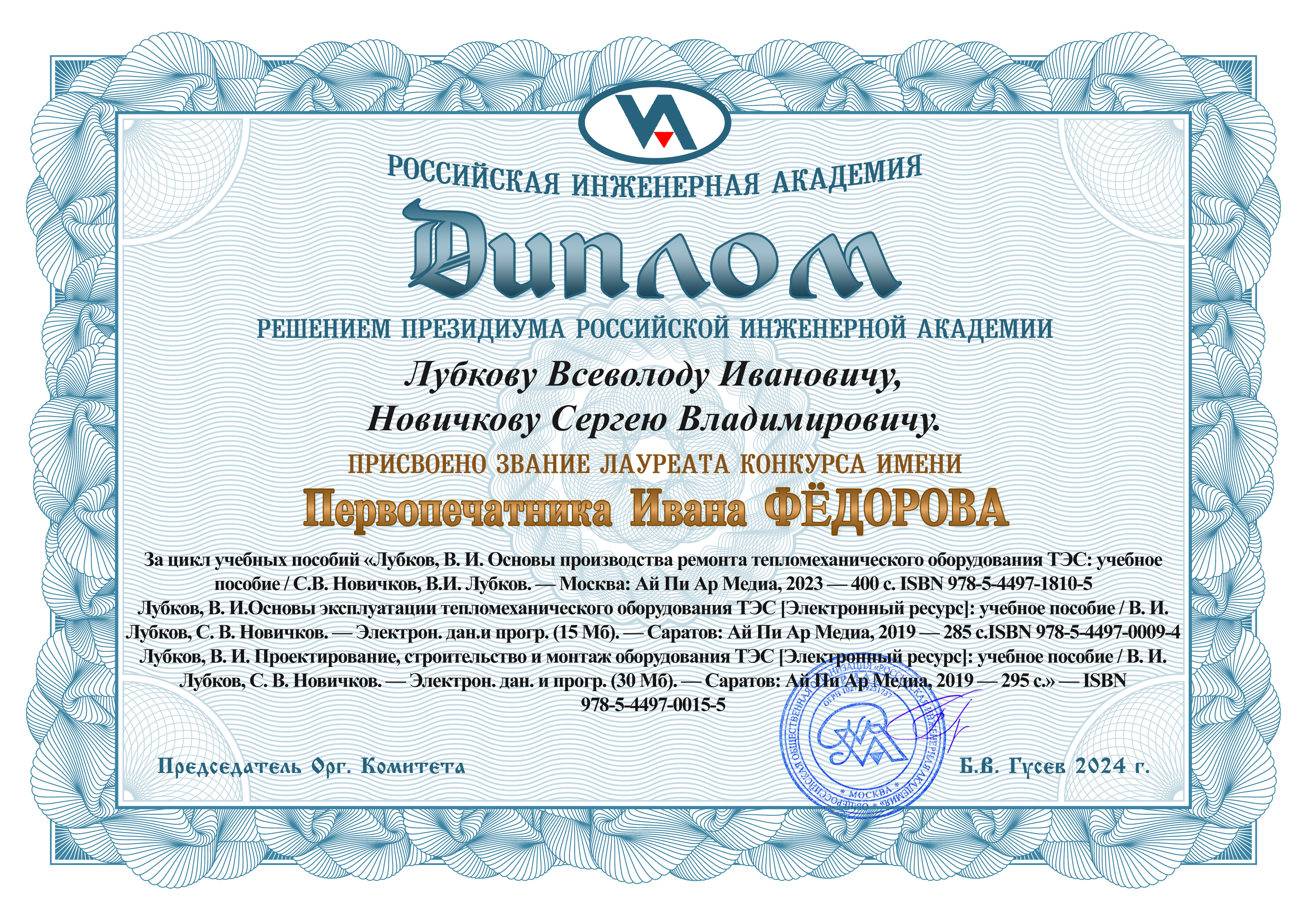Доценту кафедры «Тепловая и атомная энергетика» имени А.И. Андрющенко Института энергетики СГТУ имени Гагарина Ю.А. Сергею Новичкову присвоено звание лауреата конкурса имени первопечатника Ивана Федорова за создание цикла учебных пособий по проектированию, строительству и монтажу, эксплуатации и ремонту теплоэнергетического оборудования на тепловых электростанциях (ТЭС).