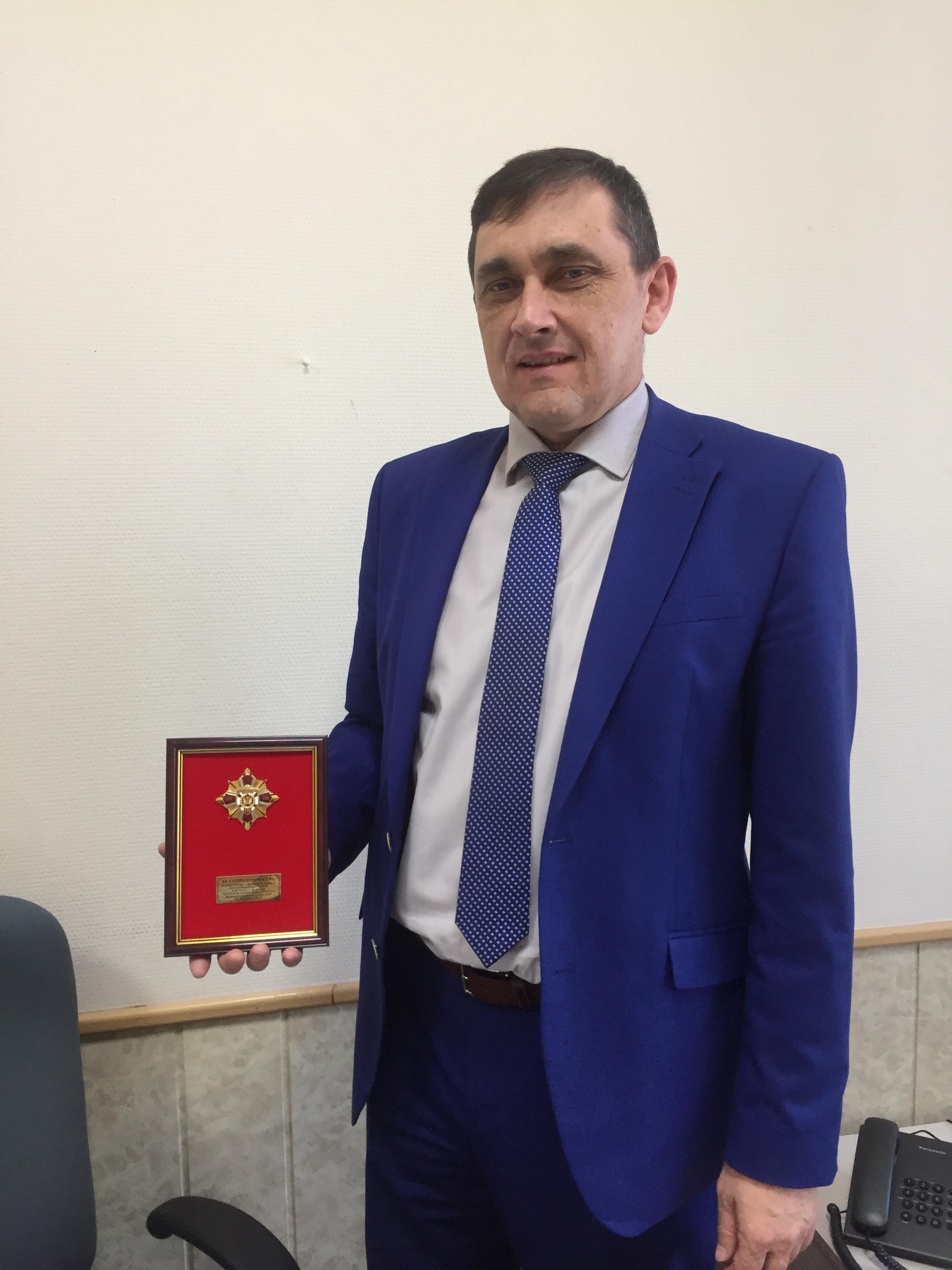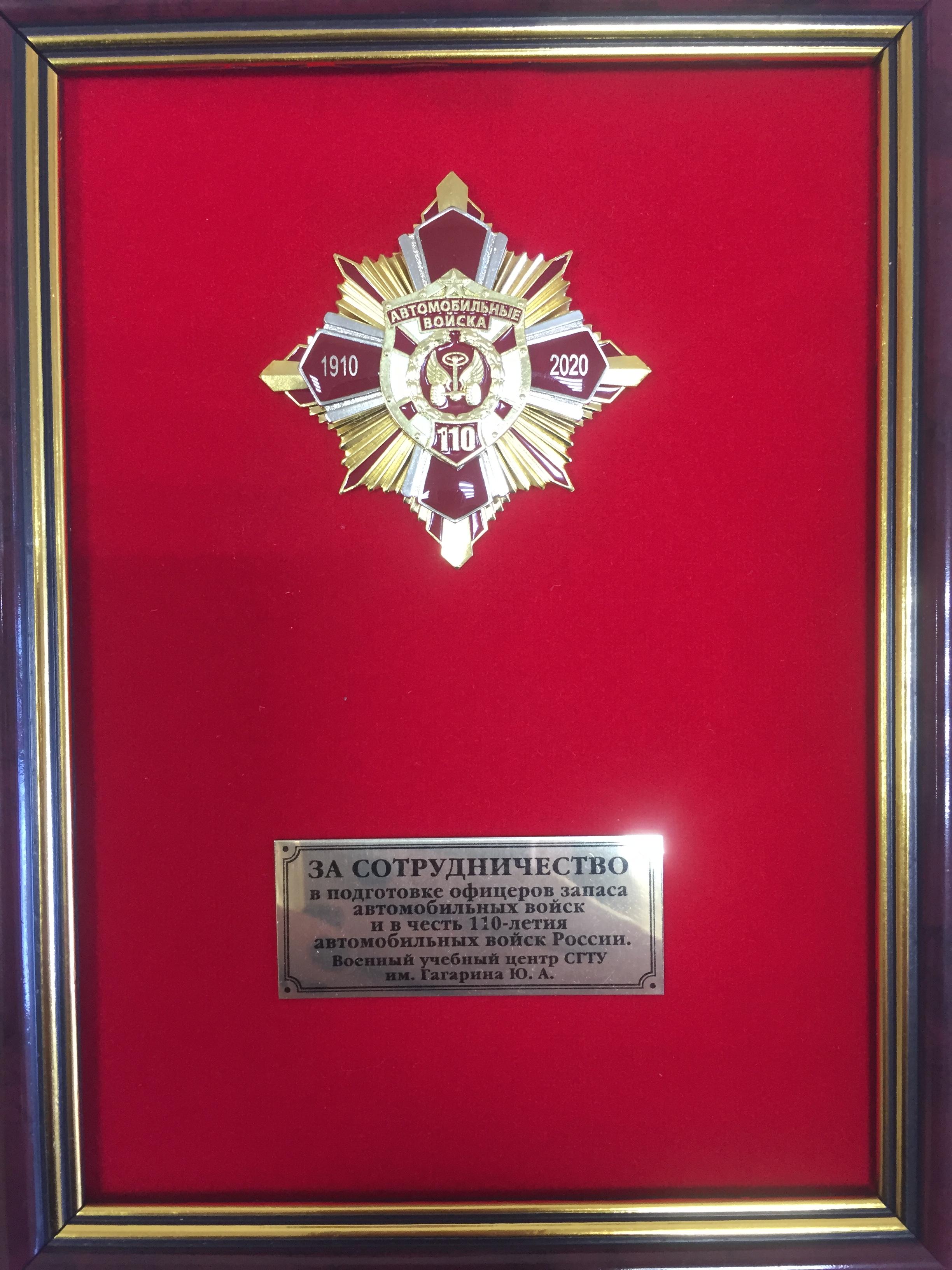 Начальник Военного учебного центра полковник Петр Михайличенко вручил коллективам Института машиностроения, материаловедения и Института энергетики и транспортных систем СГТУ памятный знак «За сотрудничество в подготовке офицеров запаса автомобильных войск и в честь 110-летия автомобильных войск России».
